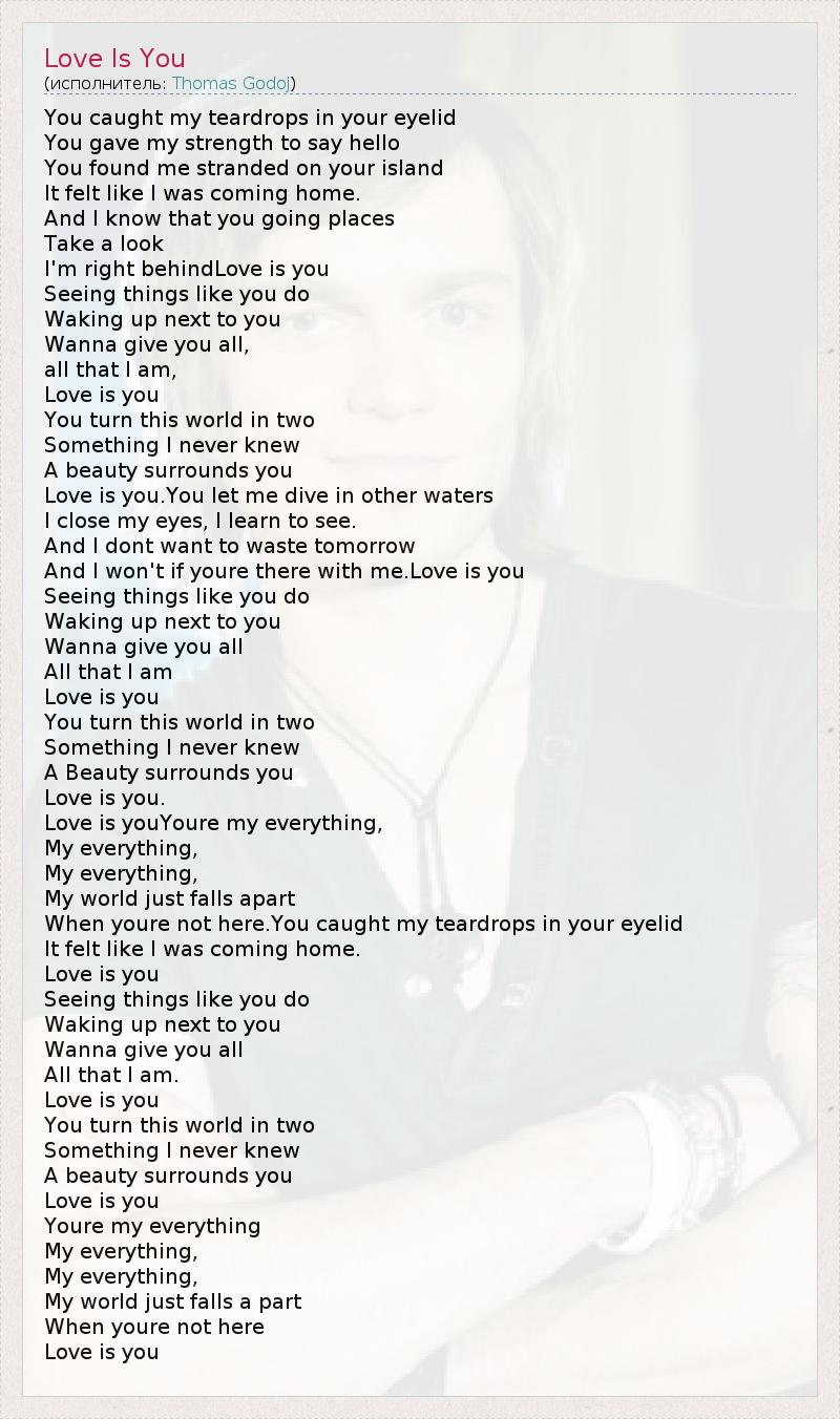 You caught my teardrops in your eyelid You gave my strength to say hello You found me stranded on your island It felt like I was coming home. And I know that you going places Take a look I'm right behindLove is you Seeing things like you do Waking up next to you Wanna give you all, all that I am, Love is you You turn this world in two Something I never knew A beauty surrounds you Love is you.You let me dive in other waters I close my eyes, I learn to see. And I dont want to waste tomorrow And I won't if youre there with me.Love is you Seeing things like you do Waking up next to you Wanna give you all All that I am Love is you You turn this world in two Something I never knew A Beauty surrounds you Love is you. Love is youYoure my everything, My everything, My everything, My world just falls apart When youre not here.You caught my teardrops in your eyelid It felt like I was coming home. Love is you Seeing things like you do Waking up next to you Wanna give you all All that I am. Love is you You turn this world in two Something I never knew A beauty surrounds you Love is you Youre my everything My everything, My everything, My world just falls a part When youre not here Love is you