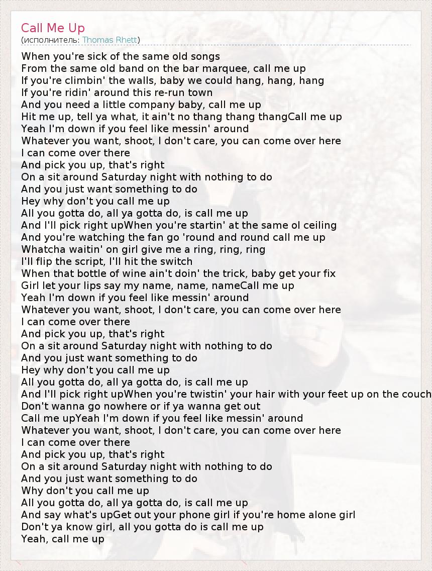 When you're sick of the same old songs From the same old band on the bar marquee, call me up If you're climbin' the walls, baby we could hang, hang, hang If you're ridin' around this re-run town And you need a little company baby, call me up Hit me up, tell ya what, it ain't no thang thang thangCall me up Yeah I'm down if you feel like messin' around Whatever you want, shoot, I don't care, you can come over here I can come over there And pick you up, that's right On a sit around Saturday night with nothing to do And you just want something to do Hey why don't you call me up All you gotta do, all ya gotta do, is call me up And I'll pick right upWhen you're startin' at the same ol ceiling And you're watching the fan go 'round and round call me up Whatcha waitin' on girl give me a ring, ring, ring I'll flip the script, I'll hit the switch When that bottle of wine ain't doin' the trick, baby get your fix Girl let your lips say my name, name, nameCall me up Yeah I'm down if you feel like messin' around Whatever you want, shoot, I don't care, you can come over here I can come over there And pick you up, that's right On a sit around Saturday night with nothing to do And you just want something to do Hey why don't you call me up All you gotta do, all ya gotta do, is call me up And I'll pick right upWhen you're twistin' your hair with your feet up on the couch Don't wanna go nowhere or if ya wanna get out Call me upYeah I'm down if you feel like messin' around Whatever you want, shoot, I don't care, you can come over here I can come over there And pick you up, that's right On a sit around Saturday night with nothing to do And you just want something to do Why don't you call me up All you gotta do, all ya gotta do, is call me up And say what's upGet out your phone girl if you're home alone girl Don't ya know girl, all you gotta do is call me up Yeah, call me up