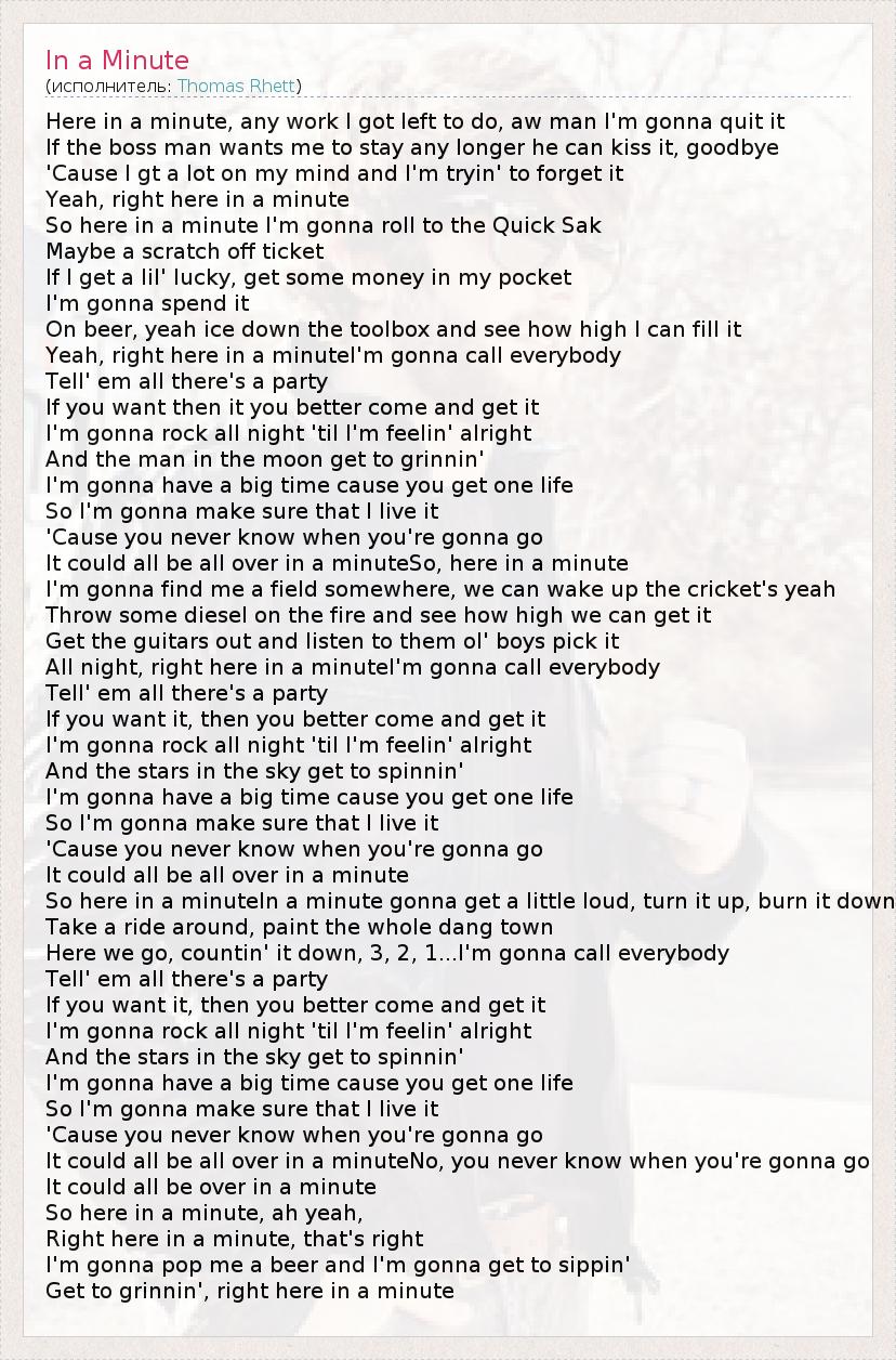 Here in a minute, any work I got left to do, aw man I'm gonna quit it If the boss man wants me to stay any longer he can kiss it, goodbye 'Cause I gt a lot on my mind and I'm tryin' to forget it Yeah, right here in a minute So here in a minute I'm gonna roll to the Quick Sak Maybe a scratch off ticket If I get a lil' lucky, get some money in my pocket I'm gonna spend it On beer, yeah ice down the toolbox and see how high I can fill it Yeah, right here in a minuteI'm gonna call everybody Tell' em all there's a party If you want then it you better come and get it I'm gonna rock all night 'til I'm feelin' alright And the man in the moon get to grinnin' I'm gonna have a big time cause you get one life So I'm gonna make sure that I live it 'Cause you never know when you're gonna go It could all be all over in a minuteSo, here in a minute I'm gonna find me a field somewhere, we can wake up the cricket's yeah Throw some diesel on the fire and see how high we can get it Get the guitars out and listen to them ol' boys pick it All night, right here in a minuteI'm gonna call everybody Tell' em all there's a party If you want it, then you better come and get it I'm gonna rock all night 'til I'm feelin' alright And the stars in the sky get to spinnin' I'm gonna have a big time cause you get one life So I'm gonna make sure that I live it 'Cause you never know when you're gonna go It could all be all over in a minute So here in a minuteIn a minute gonna get a little loud, turn it up, burn it down Take a ride around, paint the whole dang town Here we go, countin' it down, 3, 2, 1...I'm gonna call everybody Tell' em all there's a party If you want it, then you better come and get it I'm gonna rock all night 'til I'm feelin' alright And the stars in the sky get to spinnin' I'm gonna have a big time cause you get one life So I'm gonna make sure that I live it 'Cause you never know when you're gonna go It could all be all over in a minuteNo, you never know when you're gonna go It could all be over in a minute So here in a minute, ah yeah, Right here in a minute, that's right I'm gonna pop me a beer and I'm gonna get to sippin' Get to grinnin', right here in a minute
