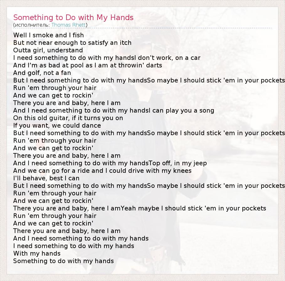 Well I smoke and I fish But not near enough to satisfy an itch Outta girl, understand I need something to do with my handsI don't work, on a car And I'm as bad at pool as I am at throwin' darts And golf, not a fan But I need something to do with my handsSo maybe I should stick 'em in your pockets Run 'em through your hair And we can get to rockin' There you are and baby, here I am And I need something to do with my handsI can play you a song On this old guitar, if it turns you on If you want, we could dance But I need something to do with my handsSo maybe I should stick 'em in your pockets Run 'em through your hair And we can get to rockin' There you are and baby, here I am And I need something to do with my handsTop off, in my jeep And we can go for a ride and I could drive with my knees I'll behave, best I can But I need something to do with my handsSo maybe I should stick 'em in your pockets Run 'em through your hair And we can get to rockin' There you are and baby, here I amYeah maybe I should stick 'em in your pockets Run 'em through your hair And we can get to rockin' There you are and baby, here I am And I need something to do with my hands I need something to do with my hands With my hands Something to do with my hands