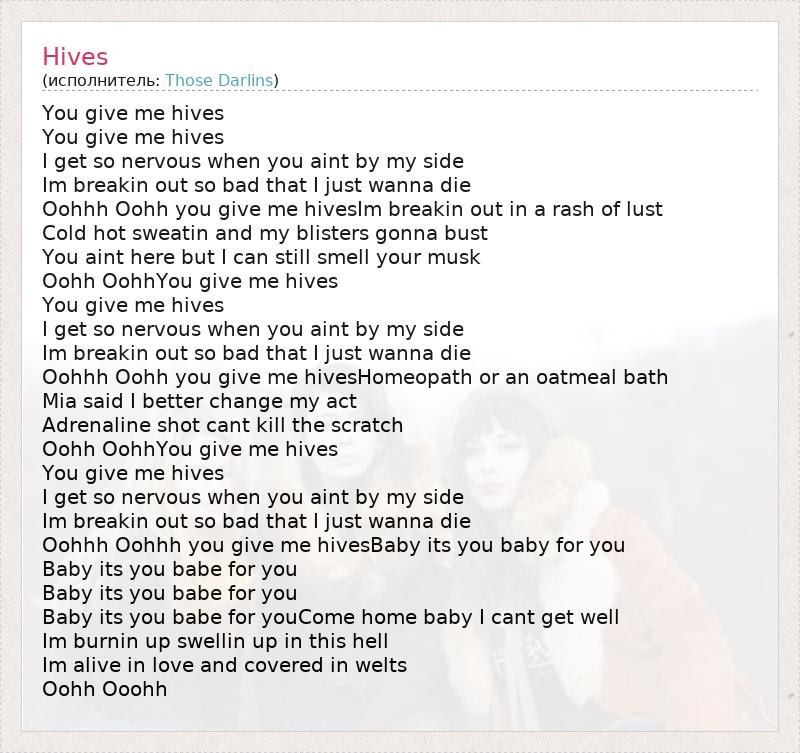 Oohhh Oohh you give me hivesIm breakin out in a rash of lust