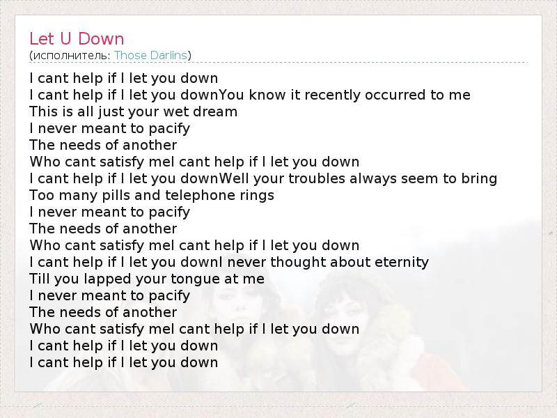I cant help if I let you down I cant help if I let you downYou know it recently occurred to me This is all just your wet dream I never meant to pacify The needs of another Who cant satisfy meI cant help if I let you down I cant help if I let you downWell your troubles always seem to bring Too many pills and telephone rings I never meant to pacify The needs of another Who cant satisfy meI cant help if I let you down I cant help if I let you downI never thought about eternity Till you lapped your tongue at me I never meant to pacify The needs of another Who cant satisfy meI cant help if I let you down I cant help if I let you down I cant help if I let you down