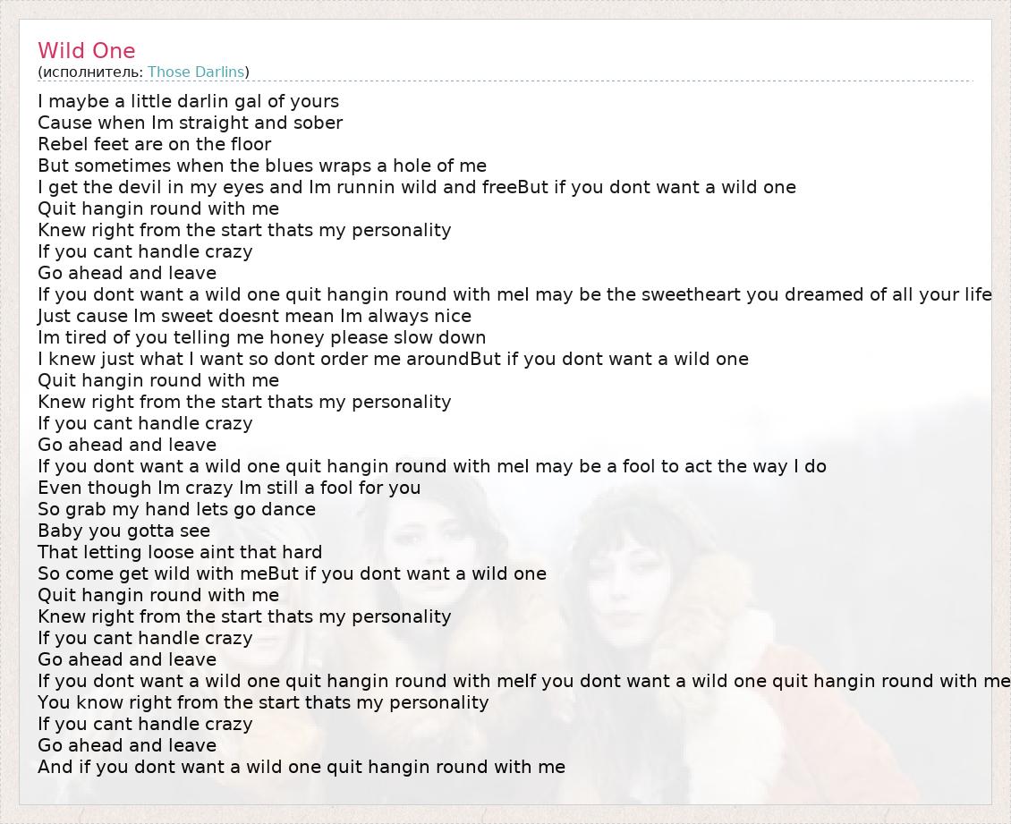 I maybe a little darlin gal of yours Cause when Im straight and sober Rebel feet are on the floor But sometimes when the blues wraps a hole of me I get the devil in my eyes and Im runnin wild and freeBut if you dont want a wild one Quit hangin round with me Knew right from the start thats my personality If you cant handle crazy Go ahead and leave If you dont want a wild one quit hangin round with meI may be the sweetheart you dreamed of all your life Just cause Im sweet doesnt mean Im always nice Im tired of you telling me honey please slow down I knew just what I want so dont order me aroundBut if you dont want a wild one Quit hangin round with me Knew right from the start thats my personality If you cant handle crazy Go ahead and leave If you dont want a wild one quit hangin round with meI may be a fool to act the way I do Even though Im crazy Im still a fool for you So grab my hand lets go dance Baby you gotta see That letting loose aint that hard So come get wild with meBut if you dont want a wild one Quit hangin round with me Knew right from the start thats my personality If you cant handle crazy Go ahead and leave If you dont want a wild one quit hangin round with meIf you dont want a wild one quit hangin round with me You know right from the start thats my personality If you cant handle crazy Go ahead and leave And if you dont want a wild one quit hangin round with me