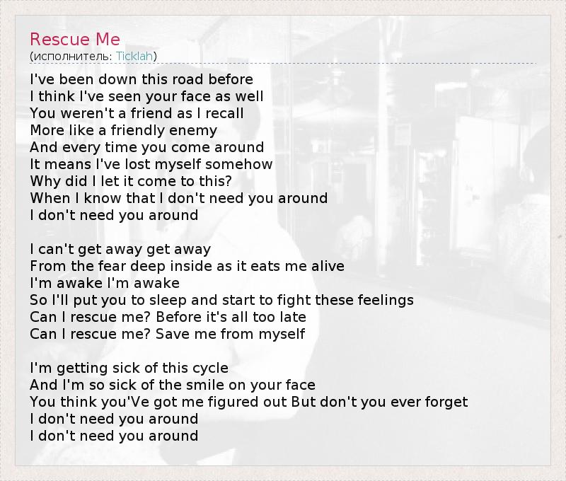 I've been down this road before I think I've seen your face as well You weren't a friend as I recall More like a friendly enemy And every time you come around It means I've lost myself somehow Why did I let it come to this? When I know that I don't need you around I don't need you around I can't get away get away From the fear deep inside as it eats me alive I'm awake I'm awake So I'll put you to sleep and start to fight these feelings Can I rescue me? Before it's all too late Can I rescue me? Save me from myself I'm getting sick of this cycle And I'm so sick of the smile on your face You think you'Ve got me figured out But don't you ever forget I don't need you around I don't need you around