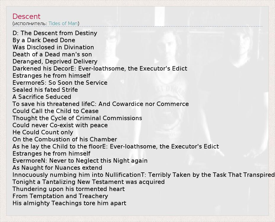 D: The Descent from Destiny By a Dark Deed Done Was Disclosed in Divination Death of a Dead man's son Deranged, Deprived Delivery Darkened his DecorE: Ever-loathsome, the Executor's Edict Estranges he from himself EvermoreS: So Soon the Service Sealed his fated Strife A Sacrifice Seduced To save his threatened lifeC: And Cowardice nor Commerce Could Call the Child to Cease Thought the Cycle of Criminal Commissions Could never Co-exist with peace He Could Count only On the Combustion of his Chamber As he lay the Child to the floorE: Ever-loathsome, the Executor's Edict Estranges he from himself EvermoreN: Never to Neglect this Night again As Naught for Nuances extend Innocuously numbing him into NullificationT: Terribly Taken by the Task That Transpired Tonight a Tantalizing New Testament was acquired Thundering upon his tormented heart From Temptation and Treachery His almighty Teachings tore him apart