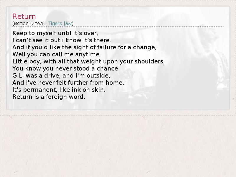 Keep to myself until it's over, I can't see it but i know it's there. And if you'd like the sight of failure for a change, Well you can call me anytime. Little boy, with all that weight upon your shoulders, You know you never stood a chance G.L. was a drive, and i'm outside, And i've never felt further from home. It's permanent, like ink on skin. Return is a foreign word.