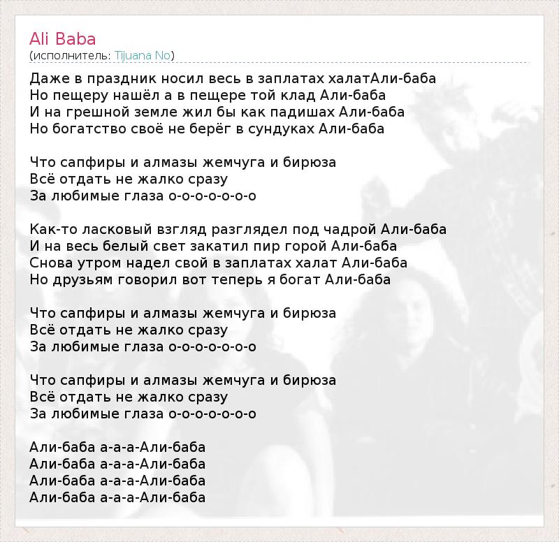 Даже в праздник носил весь в заплатах халатАли-баба Но пещеру нашёл а в пещере той клад Али-баба И на грешной земле жил бы как падишах Али-баба Но богатство своё не берёг в сундуках Али-баба Что сапфиры и алмазы жемчуга и бирюза Всё отдать не жалко сразу За любимые глаза о-о-о-о-о-о-о Как-то ласковый взгляд разглядел под чадрой Али-баба И на весь белый свет закатил пир горой Али-баба Снова утром надел свой в заплатах халат Али-баба Но друзьям говорил вот теперь я богат Али-баба Что сапфиры и алмазы жемчуга и бирюза Всё отдать не жалко сразу За любимые глаза о-о-о-о-о-о-о Что сапфиры и алмазы жемчуга и бирюза Всё отдать не жалко сразу За любимые глаза о-о-о-о-о-о-о Али-баба a-а-а-Aли-баба Али-баба a-а-а-Aли-баба Али-баба a-а-а-Aли-баба Али-баба a-а-а-Aли-баба