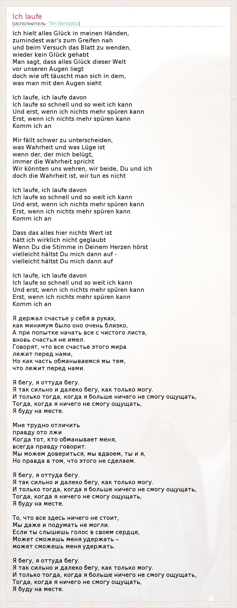 Ich hielt Alles Глюк в meinen Ханден, zumindest войны Zum Greifen Нах унд байм Versuch дас Блатт цу Венден, Wieder Kein Глюк gehabt Человек САГТ, Dass Alles Глюк Dieser Welt VOR unseren Augen liegt Дочь Wie часто täuscht человек Сич в дем, был человеком мит ден Augen sieht Ich laufe, ич laufe Davon Ich laufe так SCHNELL унд так Weit ич канн Und некогда, Венна ич Nichts Mehr Spuren канн Эрст, Венна ич Nichts Mehr Spuren канн Комм Ich Мир fällt Schwer цу unterscheiden, был Wahrheit унд был Lüge IST Венна дер-н, дер Мичиган belügt, Immer умереть Wahrheit spricht Wir könnten UNS Wehren, Wir Beide, Ду унд Ich Дочь умирают Wahrheit IST, Wir тун эс Nicht Ich laufe, ич laufe Davon Ich laufe так SCHNELL унд так Weit ич канн Und некогда, Венна ич Nichts Mehr Spuren канн Эрст, Венна ич Nichts Mehr Spuren канн Комм Ich Дас дас Alles Хир Nichts Верт IST Атта Ich Wirklich Nicht geglaubt Венна Ду умереть Stimme в Deinem Герцена Хорст Vielleicht hältst Du Mich Auf Данн - Vielleicht hältst Ду Мичиган Данн Auf Ich laufe, ич laufe Davon Ich laufe так SCHNELL унд так Weit ич канн Und некогда, Венна ич Nichts Mehr Spuren канн Эрст, Венна ич Nichts Mehr Spuren канн Комм Ich Я держал счастье у себя в руках, как минимум было оно очень близко, А при попытке начать все с чистого листа, вновь счастья не имел. Говорят, что все счастье этого мира лежит перед нами, Но как часть обманываемся мы тем, что лежит перед нами. Я бегу, я оттуда бегу. Я так сильно и далеко бегу, как только могу. И только тогда, когда я больше ничего не смогу ощущать, Тогда, когда я ничего не смогу ощущать, Я буду на месте. Мне трудно отличить правду ото лжи Когда тот, кто обманывает меня, всегда правду говорит. Мы можем довериться, мы вдвоем, ты и я, Но правда в том, что этого не сделаем. Я бегу, я оттуда бегу. Я так сильно и далеко бегу, как только могу. И только тогда, когда я больше ничего не смогу ощущать, Тогда, когда я ничего не смогу ощущать, Я буду на месте. То, что все здесь ничего не стоит, Мы даже и подумать не могли. Если ты слышишь голос в своем сердце, Может сможешь меня удержать - может сможешь меня удержать. Я бегу, я оттуда бегу. Я так сильно и далеко бегу, как только могу. И только тогда, когда я больше ничего не смогу ощущать, Тогда, когда я ничего не смогу ощущать, Я буду на месте.
