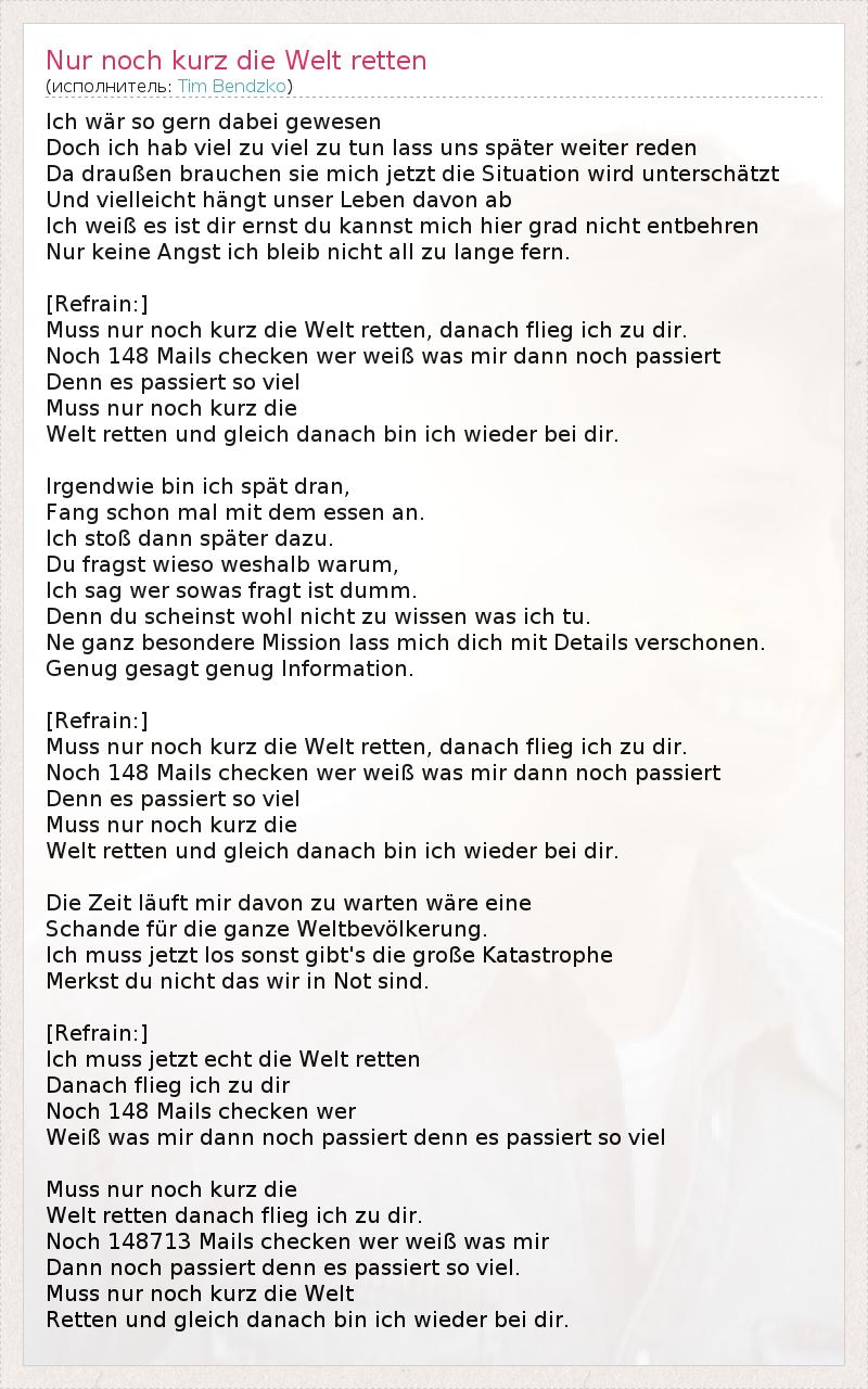 Ich wär so gern dabei gewesen Doch ich hab viel zu viel zu tun lass uns später weiter reden Da draußen brauchen sie mich jetzt die Situation wird unterschätzt Und vielleicht hängt unser Leben davon ab Ich weiß es ist dir ernst du kannst mich hier grad nicht entbehren Nur keine Angst ich bleib nicht all zu lange fern. [Refrain:] Muss nur noch kurz die Welt retten, danach flieg ich zu dir. Noch 148 Mails checken wer weiß was mir dann noch passiert Denn es passiert so viel Muss nur noch kurz die Welt retten und gleich danach bin ich wieder bei dir. Irgendwie bin ich spät dran, Fang schon mal mit dem essen an. Ich stoß dann später dazu. Du fragst wieso weshalb warum, Ich sag wer sowas fragt ist dumm. Denn du scheinst wohl nicht zu wissen was ich tu. Ne ganz besondere Mission lass mich dich mit Details verschonen. Genug gesagt genug Information. [Refrain:] Muss nur noch kurz die Welt retten, danach flieg ich zu dir. Noch 148 Mails checken wer weiß was mir dann noch passiert Denn es passiert so viel Muss nur noch kurz die Welt retten und gleich danach bin ich wieder bei dir. Die Zeit läuft mir davon zu warten wäre eine Schande für die ganze Weltbevölkerung. Ich muss jetzt los sonst gibt's die große Katastrophe Merkst du nicht das wir in Not sind. [Refrain:] Ich muss jetzt echt die Welt retten Danach flieg ich zu dir Noch 148 Mails checken wer Weiß was mir dann noch passiert denn es passiert so viel Muss nur noch kurz die Welt retten danach flieg ich zu dir. Noch 148713 Mails checken wer weiß was mir Dann noch passiert denn es passiert so viel. Muss nur noch kurz die Welt Retten und gleich danach bin ich wieder bei dir.