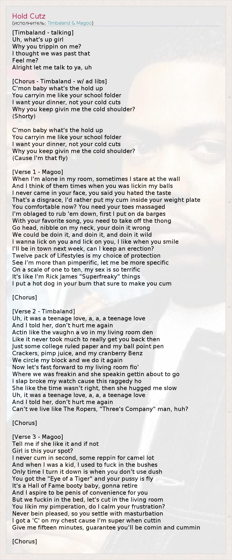 [Timbaland - talking] Uh, what's up girl Why you trippin on me? I thought we was past that Feel me? Alright let me talk to ya, uh [Chorus - Timbaland - w/ ad libs] C'mon baby what's the hold up You carryin me like your school folder I want your dinner, not your cold cuts Why you keep givin me the cold shoulder? (Shorty) C'mon baby what's the hold up You carryin me like your school folder I want your dinner, not your cold cuts Why you keep givin me the cold shoulder? (Cause I'm that fly) [Verse 1 - Magoo] When I'm alone in my room, sometimes I stare at the wall And I think of them times when you was lickin my balls I never came in your face, you said you hated the taste That's a disgrace, I'd rather put my cum inside your weight plate You comfortable now? You need your toes massaged I'm oblaged to rub 'em down, first I put on da barges With your favorite song, you need to take off the thong Go head, nibble on my neck, your doin it wrong We could be doin it, and doin it, and doin it wild I wanna lick on you and lick on you, I like when you smile I'll be in town next week, can I keep an erection? Twelve pack of Lifestyles is my choice of protection See I'm more than pimperific, let me be more specific On a scale of one to ten, my sex is so terrific It's like I'm Rick James "Superfreaky" things I put a hot dog in your bum that sure to make you cum [Chorus] [Verse 2 - Timbaland] Uh, it was a teenage love, a, a, a teenage love And I told her, don't hurt me again Actin like the vaughn a vo in my living room den Like it never took much to really get you back then Just some college ruled paper and my ball point pen Crackers, pimp juice, and my cranberry Benz We circle my block and we do it again Now let's fast forward to my living room flo' Where we was freakin and she speakin gettin about to go I slap broke my watch cause this raggedy ho She like the time wasn't right, then she hugged me slow Uh, it was a teenage love, a, a, a teenage love And I told her, don't hurt me again Can't we live like The Ropers, "Three's Company" man, huh? [Chorus] [Verse 3 - Magoo] Tell me if she like it and if not Girl is this your spot? I never cum in second, some reppin for camel lot And when I was a kid, I used to fuck in the bushes Only time I turn it down is when you don't use dush You got the "Eye of a Tiger" and your pussy is fly It's a Hall of Fame booty baby, gonna retire And I aspire to be penis of convenience for you But we fuckin in the bed, let's cut in the living room You likin my pimperation, do I calm your frustration? Never bein pleased, so you settle with masturbation I got a 'C' on my chest cause I'm super when cuttin Give me fifteen minutes, guarantee you'll be comin and cummin [Chorus]