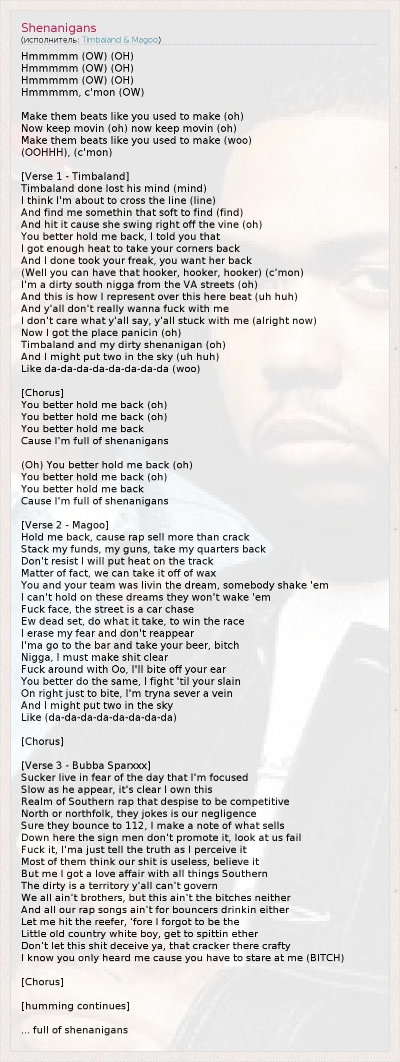Hmmmmm (OW) (OH) Hmmmmm (OW) (OH) Hmmmmm (OW) (OH) Hmmmmm, c'mon (OW) Make them beats like you used to make (oh) Now keep movin (oh) now keep movin (oh) Make them beats like you used to make (woo) (OOHHH), (c'mon) [Verse 1 - Timbaland] Timbaland done lost his mind (mind) I think I'm about to cross the line (line) And find me somethin that soft to find (find) And hit it cause she swing right off the vine (oh) You better hold me back, I told you that I got enough heat to take your corners back And I done took your freak, you want her back (Well you can have that hooker, hooker, hooker) (c'mon) I'm a dirty south nigga from the VA streets (oh) And this is how I represent over this here beat (uh huh) And y'all don't really wanna fuck with me I don't care what y'all say, y'all stuck with me (alright now) Now I got the place panicin (oh) Timbaland and my dirty shenanigan (oh) And I might put two in the sky (uh huh) Like da-da-da-da-da-da-da-da (woo) [Chorus] You better hold me back (oh) You better hold me back (oh) You better hold me back Cause I'm full of shenanigans (Oh) You better hold me back (oh) You better hold me back (oh) You better hold me back Cause I'm full of shenanigans [Verse 2 - Magoo] Hold me back, cause rap sell more than crack Stack my funds, my guns, take my quarters back Don't resist I will put heat on the track Matter of fact, we can take it off of wax You and your team was livin the dream, somebody shake 'em I can't hold on these dreams they won't wake 'em Fuck face, the street is a car chase Ew dead set, do what it take, to win the race I erase my fear and don't reappear I'ma go to the bar and take your beer, bitch Nigga, I must make shit clear Fuck around with Oo, I'll bite off your ear You better do the same, I fight 'til your slain On right just to bite, I'm tryna sever a vein And I might put two in the sky Like (da-da-da-da-da-da-da-da) [Chorus] [Verse 3 - Bubba Sparxxx] Sucker live in fear of the day that I'm focused Slow as he appear, it's clear I own this Realm of Southern rap that despise to be competitive North or northfolk, they jokes is our negligence Sure they bounce to 112, I make a note of what sells Down here the sign men don't promote it, look at us fail Fuck it, I'ma just tell the truth as I perceive it Most of them think our shit is useless, believe it But me I got a love affair with all things Southern The dirty is a territory y'all can't govern We all ain't brothers, but this ain't the bitches neither And all our rap songs ain't for bouncers drinkin either Let me hit the reefer, 'fore I forgot to be the Little old country white boy, get to spittin ether Don't let this shit deceive ya, that cracker there crafty I know you only heard me cause you have to stare at me (BITCH) [Chorus] [humming continues] ... full of shenanigans