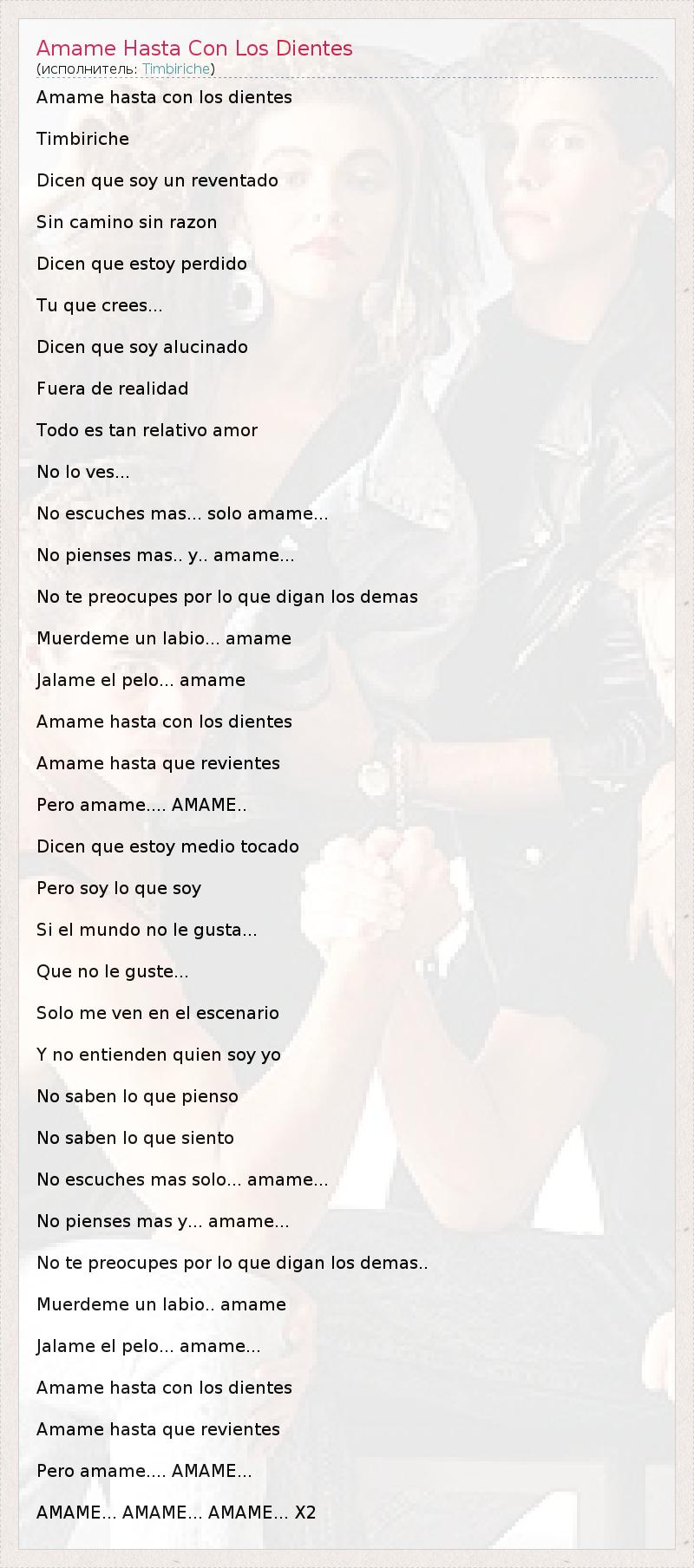 Amame hasta con los dientes Timbiriche Dicen que soy un reventado Sin camino sin razon Dicen que estoy perdido Tu que crees... Dicen que soy alucinado Fuera de realidad Todo es tan relativo amor No lo ves... No escuches mas... solo amame... No pienses mas.. y.. amame... No te preocupes por lo que digan los demas Muerdeme un labio... amame Jalame el pelo... amame Amame hasta con los dientes Amame hasta que revientes Pero amame.... AMAME.. Dicen que estoy medio tocado Pero soy lo que soy Si el mundo no le gusta... Que no le guste... Solo me ven en el escenario Y no entienden quien soy yo No saben lo que pienso No saben lo que siento No escuches mas solo... amame... No pienses mas y... amame... No te preocupes por lo que digan los demas.. Muerdeme un labio.. amame Jalame el pelo... amame... Amame hasta con los dientes Amame hasta que revientes Pero amame.... AMAME... AMAME... AMAME... AMAME... X2