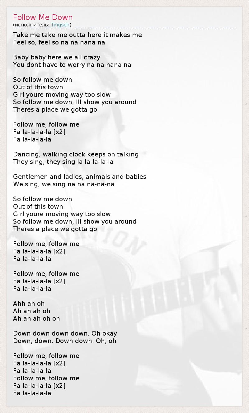 Take me take me outta here it makes me Feel so, feel so na na nana na Baby baby here we all crazy You dont have to worry na na nana na So follow me down Out of this town Girl youre moving way too slow So follow me down, Ill show you around Theres a place we gotta go Follow me, follow me Fa la-la-la-la [x2] Fa la-la-la-la Dancing, walking clock keeps on talking They sing, they sing la la-la-la-la Gentlemen and ladies, animals and babies We sing, we sing na na na-na-na So follow me down Out of this town Girl youre moving way too slow So follow me down, Ill show you around Theres a place we gotta go Follow me, follow me Fa la-la-la-la [x2] Fa la-la-la-la Follow me, follow me Fa la-la-la-la [x2] Fa la-la-la-la Ahh ah oh Ah ah ah oh Ah ah ah oh oh Down down down down. Oh okay Down, down. Down down. Oh, oh Follow me, follow me Fa la-la-la-la [x2] Fa la-la-la-la Follow me, follow me Fa la-la-la-la [x2] Fa la-la-la-la