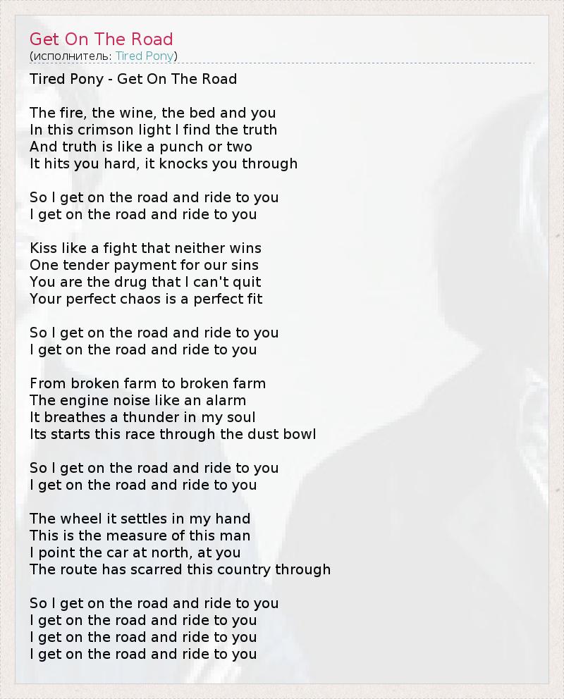 Tired Pony - Get On The Road The fire, the wine, the bed and you In this crimson light I find the truth And truth is like a punch or two It hits you hard, it knocks you through So I get on the road and ride to you I get on the road and ride to you Kiss like a fight that neither wins One tender payment for our sins You are the drug that I can't quit Your perfect chaos is a perfect fit So I get on the road and ride to you I get on the road and ride to you From broken farm to broken farm The engine noise like an alarm It breathes a thunder in my soul Its starts this race through the dust bowl So I get on the road and ride to you I get on the road and ride to you The wheel it settles in my hand This is the measure of this man I point the car at north, at you The route has scarred this country through So I get on the road and ride to you I get on the road and ride to you I get on the road and ride to you I get on the road and ride to you