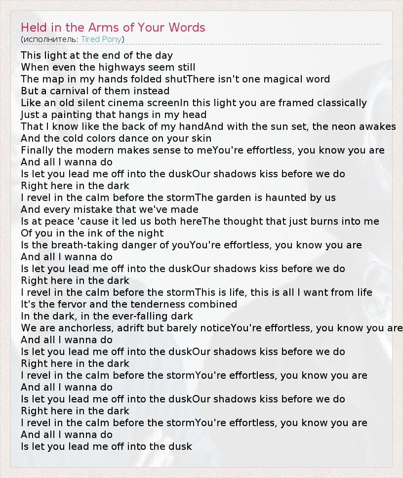 А как ты думаешь, о чем песня "Held in the Arms of Your Words" ?