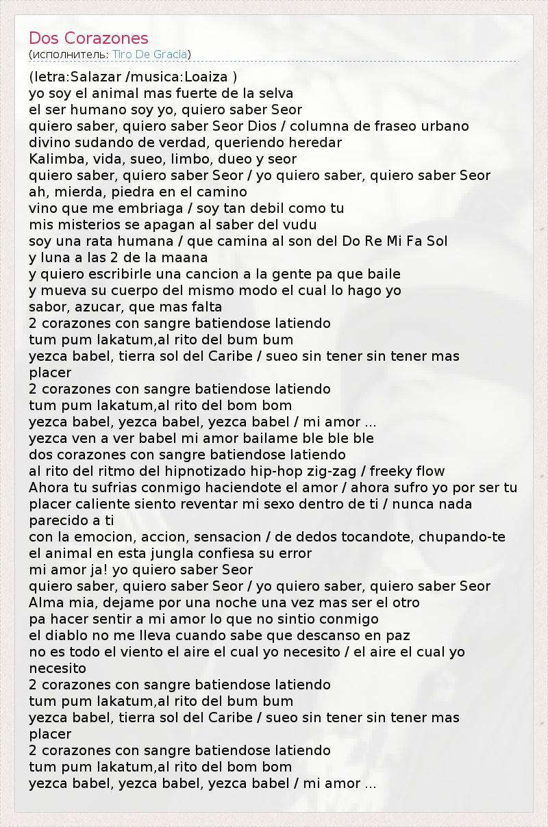 (letra:Salazar /musica:Loaiza ) yo soy el animal mas fuerte de la selva el ser humano soy yo, quiero saber Seor quiero saber, quiero saber Seor Dios / columna de fraseo urbano divino sudando de verdad, queriendo heredar Kalimba, vida, sueo, limbo, dueo y seor quiero saber, quiero saber Seor / yo quiero saber, quiero saber Seor ah, mierda, piedra en el camino vino que me embriaga / soy tan debil como tu mis misterios se apagan al saber del vudu soy una rata humana / que camina al son del Do Re Mi Fa Sol y luna a las 2 de la maana y quiero escribirle una cancion a la gente pa que baile y mueva su cuerpo del mismo modo el cual lo hago yo sabor, azucar, que mas falta 2 corazones con sangre batiendose latiendo tum pum lakatum,al rito del bum bum yezca babel, tierra sol del Caribe / sueo sin tener sin tener mas placer 2 corazones con sangre batiendose latiendo tum pum lakatum,al rito del bom bom yezca babel, yezca babel, yezca babel / mi amor ... yezca ven a ver babel mi amor bailame ble ble ble dos corazones con sangre batiendose latiendo al rito del ritmo del hipnotizado hip-hop zig-zag / freeky flow Ahora tu sufrias conmigo haciendote el amor / ahora sufro yo por ser tu placer caliente siento reventar mi sexo dentro de ti / nunca nada parecido a ti con la emocion, accion, sensacion / de dedos tocandote, chupando-te el animal en esta jungla confiesa su error mi amor ja! yo quiero saber Seor quiero saber, quiero saber Seor / yo quiero saber, quiero saber Seor Alma mia, dejame por una noche una vez mas ser el otro pa hacer sentir a mi amor lo que no sintio conmigo el diablo no me lleva cuando sabe que descanso en paz no es todo el viento el aire el cual yo necesito / el aire el cual yo necesito 2 corazones con sangre batiendose latiendo tum pum lakatum,al rito del bum bum yezca babel, tierra sol del Caribe / sueo sin tener sin tener mas placer 2 corazones con sangre batiendose latiendo tum pum lakatum,al rito del bom bom yezca babel, yezca babel, yezca babel / mi amor ...
