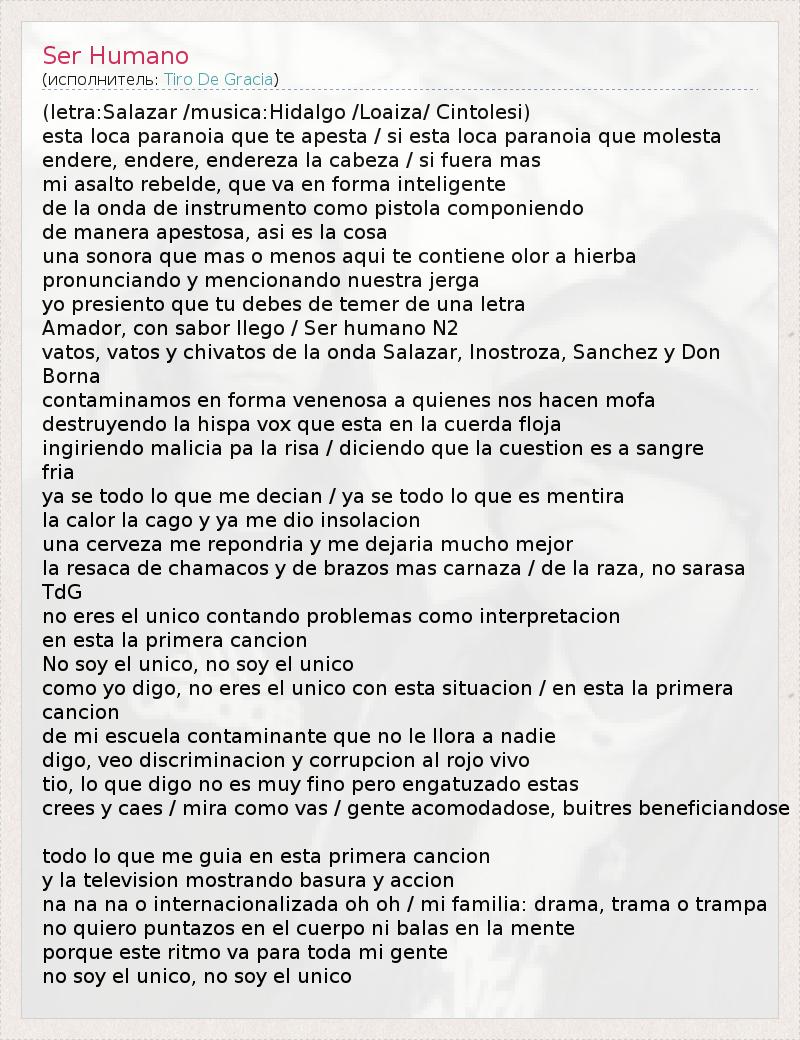 (letra:Salazar /musica:Hidalgo /Loaiza/ Cintolesi) esta loca paranoia que te apesta / si esta loca paranoia que molesta endere, endere, endereza la cabeza / si fuera mas mi asalto rebelde, que va en forma inteligente de la onda de instrumento como pistola componiendo de manera apestosa, asi es la cosa una sonora que mas o menos aqui te contiene olor a hierba pronunciando y mencionando nuestra jerga yo presiento que tu debes de temer de una letra Amador, con sabor llego / Ser humano N2 vatos, vatos y chivatos de la onda Salazar, Inostroza, Sanchez y Don Borna contaminamos en forma venenosa a quienes nos hacen mofa destruyendo la hispa vox que esta en la cuerda floja ingiriendo malicia pa la risa / diciendo que la cuestion es a sangre fria ya se todo lo que me decian / ya se todo lo que es mentira la calor la cago y ya me dio insolacion una cerveza me repondria y me dejaria mucho mejor la resaca de chamacos y de brazos mas carnaza / de la raza, no sarasa TdG no eres el unico contando problemas como interpretacion en esta la primera cancion No soy el unico, no soy el unico como yo digo, no eres el unico con esta situacion / en esta la primera cancion de mi escuela contaminante que no le llora a nadie digo, veo discriminacion y corrupcion al rojo vivo tio, lo que digo no es muy fino pero engatuzado estas crees y caes / mira como vas / gente acomodadose, buitres beneficiandose todo lo que me guia en esta primera cancion y la television mostrando basura y accion na na na o internacionalizada oh oh / mi familia: drama, trama o trampa no quiero puntazos en el cuerpo ni balas en la mente porque este ritmo va para toda mi gente no soy el unico, no soy el unico