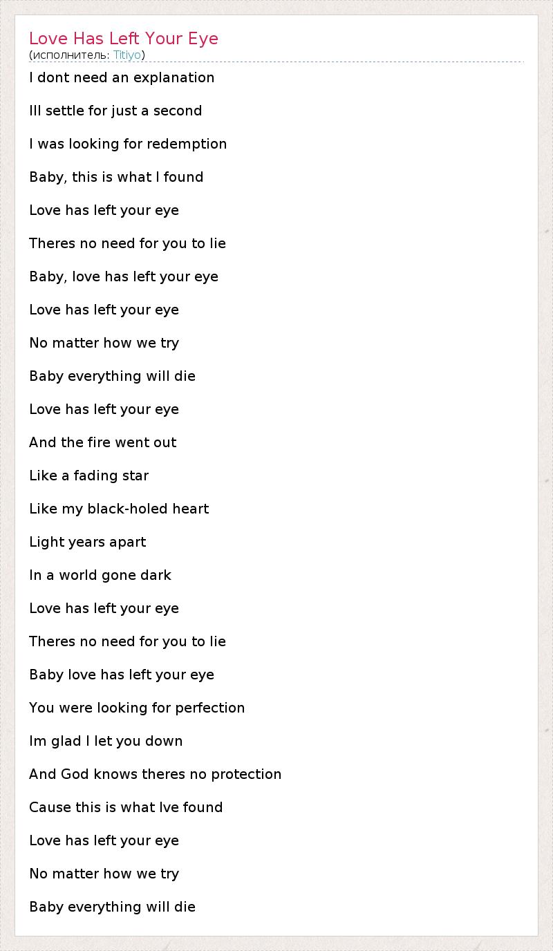 I dont need an explanation Ill settle for just a second I was looking for redemption Baby, this is what I found Love has left your eye Theres no need for you to lie Baby, love has left your eye Love has left your eye No matter how we try Baby everything will die Love has left your eye And the fire went out Like a fading star Like my black-holed heart Light years apart In a world gone dark Love has left your eye Theres no need for you to lie Baby love has left your eye You were looking for perfection Im glad I let you down And God knows theres no protection Cause this is what Ive found Love has left your eye No matter how we try Baby everything will die