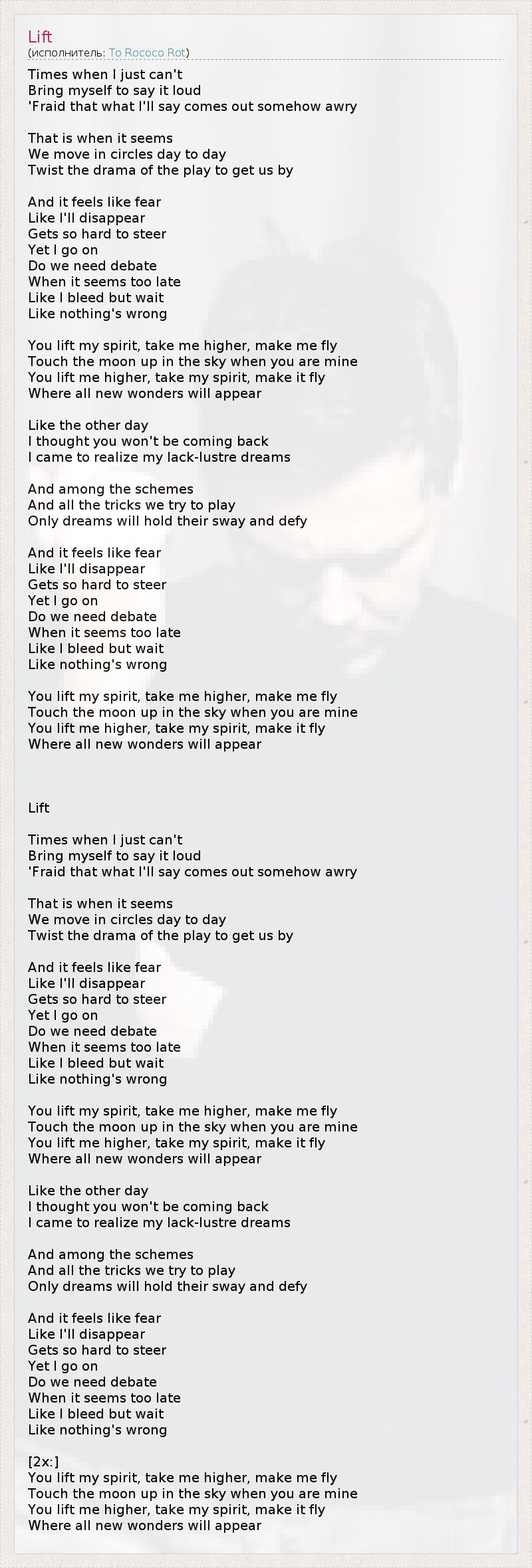 Times when I just can't Bring myself to say it loud 'Fraid that what I'll say comes out somehow awry That is when it seems We move in circles day to day Twist the drama of the play to get us by And it feels like fear Like I'll disappear Gets so hard to steer Yet I go on Do we need debate When it seems too late Like I bleed but wait Like nothing's wrong You lift my spirit, take me higher, make me fly Touch the moon up in the sky when you are mine You lift me higher, take my spirit, make it fly Where all new wonders will appear Like the other day I thought you won't be coming back I came to realize my lack-lustre dreams And among the schemes And all the tricks we try to play Only dreams will hold their sway and defy And it feels like fear Like I'll disappear Gets so hard to steer Yet I go on Do we need debate When it seems too late Like I bleed but wait Like nothing's wrong You lift my spirit, take me higher, make me fly Touch the moon up in the sky when you are mine You lift me higher, take my spirit, make it fly Where all new wonders will appear Lift Times when I just can't Bring myself to say it loud 'Fraid that what I'll say comes out somehow awry That is when it seems We move in circles day to day Twist the drama of the play to get us by And it feels like fear Like I'll disappear Gets so hard to steer Yet I go on Do we need debate When it seems too late Like I bleed but wait Like nothing's wrong You lift my spirit, take me higher, make me fly Touch the moon up in the sky when you are mine You lift me higher, take my spirit, make it fly Where all new wonders will appear Like the other day I thought you won't be coming back I came to realize my lack-lustre dreams And among the schemes And all the tricks we try to play Only dreams will hold their sway and defy And it feels like fear Like I'll disappear Gets so hard to steer Yet I go on Do we need debate When it seems too late Like I bleed but wait Like nothing's wrong [2x:] You lift my spirit, take me higher, make me fly Touch the moon up in the sky when you are mine You lift me higher, take my spirit, make it fly Where all new wonders will appear