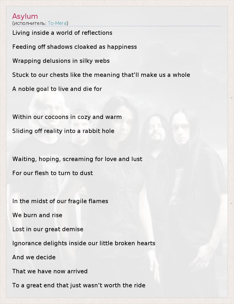 Living inside a world of reflections Feeding off shadows cloaked as happiness Wrapping delusions in silky webs Stuck to our chests like the meaning that'll make us a whole A noble goal to live and die for Within our cocoons in cozy and warm Sliding off reality into a rabbit hole Waiting, hoping, screaming for love and lust For our flesh to turn to dust In the midst of our fragile flames We burn and rise Lost in our great demise Ignorance delights inside our little broken hearts And we decide That we have now arrived To a great end that just wasn't worth the ride