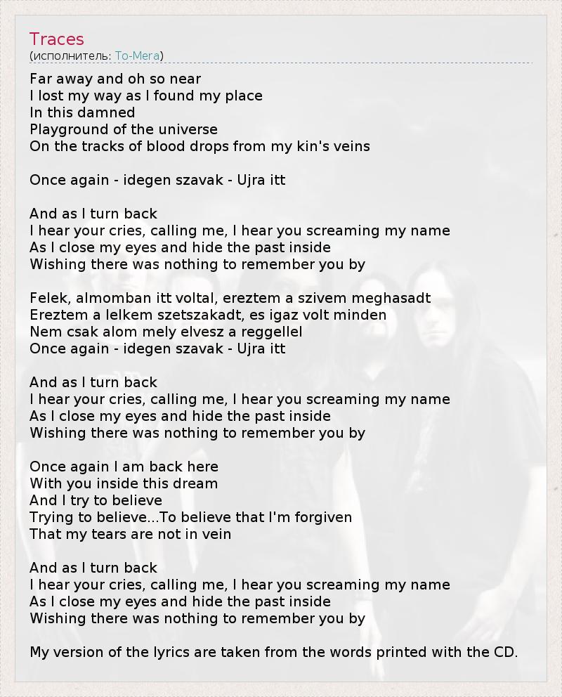 Far away and oh so near I lost my way as I found my place In this damned Playground of the universe On the tracks of blood drops from my kin's veins Once again - idegen szavak - Ujra itt And as I turn back I hear your cries, calling me, I hear you screaming my name As I close my eyes and hide the past inside Wishing there was nothing to remember you by Felek, almomban itt voltal, ereztem a szivem meghasadt Ereztem a lelkem szetszakadt, es igaz volt minden Nem csak alom mely elvesz a reggellel Once again - idegen szavak - Ujra itt And as I turn back I hear your cries, calling me, I hear you screaming my name As I close my eyes and hide the past inside Wishing there was nothing to remember you by Once again I am back here With you inside this dream And I try to believe Trying to believe...To believe that I'm forgiven That my tears are not in vein And as I turn back I hear your cries, calling me, I hear you screaming my name As I close my eyes and hide the past inside Wishing there was nothing to remember you by My version of the lyrics are taken from the words printed with the CD.