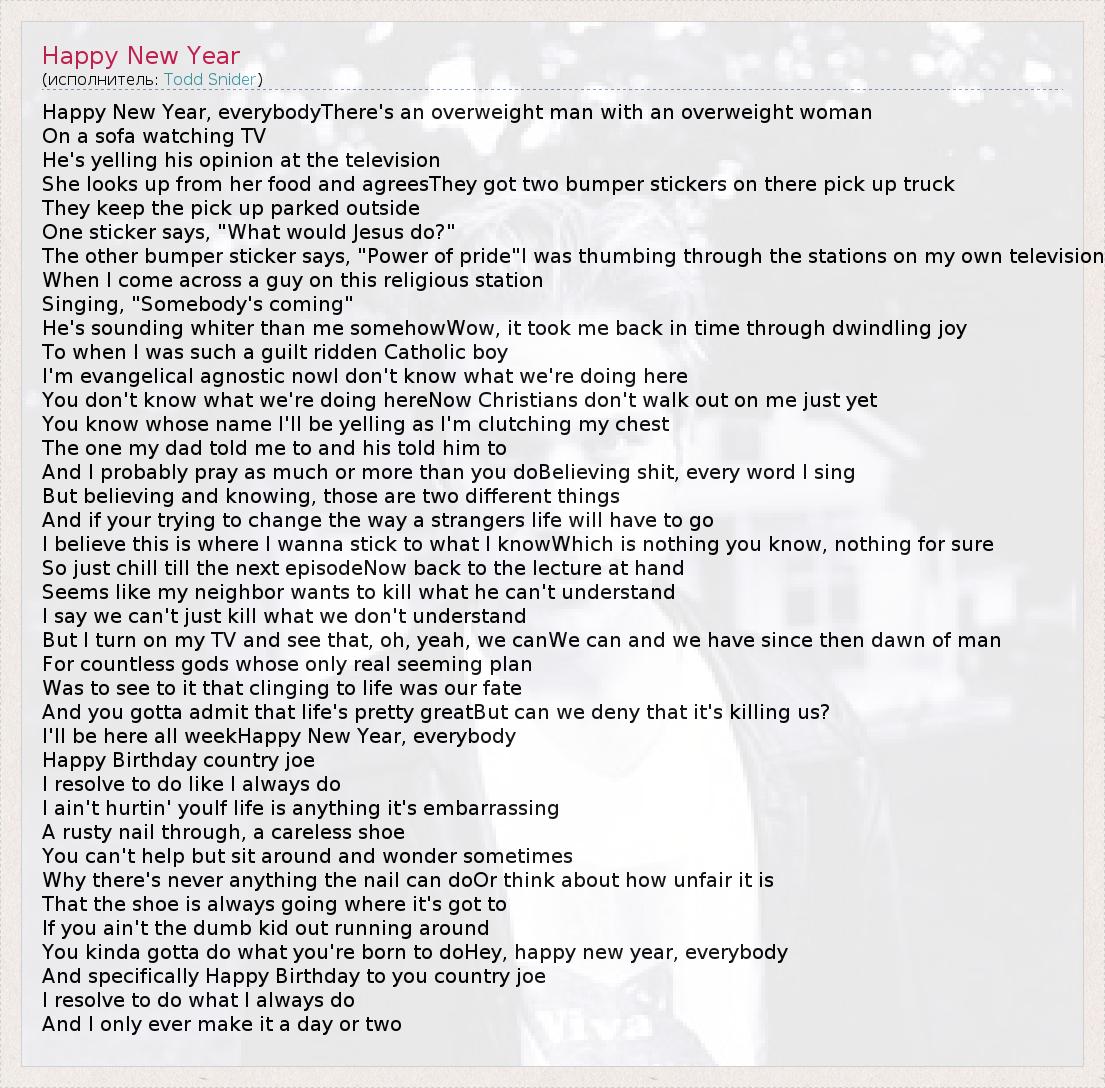 Happy New Year, everybodyThere's an overweight man with an overweight woman On a sofa watching TV He's yelling his opinion at the television She looks up from her food and agreesThey got two bumper stickers on there pick up truck They keep the pick up parked outside One sticker says, "What would Jesus do?" The other bumper sticker says, "Power of pride"I was thumbing through the stations on my own television When I come across a guy on this religious station Singing, "Somebody's coming" He's sounding whiter than me somehowWow, it took me back in time through dwindling joy To when I was such a guilt ridden Catholic boy I'm evangelical agnostic nowI don't know what we're doing here You don't know what we're doing hereNow Christians don't walk out on me just yet You know whose name I'll be yelling as I'm clutching my chest The one my dad told me to and his told him to And I probably pray as much or more than you doBelieving shit, every word I sing But believing and knowing, those are two different things And if your trying to change the way a strangers life will have to go I believe this is where I wanna stick to what I knowWhich is nothing you know, nothing for sure So just chill till the next episodeNow back to the lecture at hand Seems like my neighbor wants to kill what he can't understand I say we can't just kill what we don't understand But I turn on my TV and see that, oh, yeah, we canWe can and we have since then dawn of man For countless gods whose only real seeming plan Was to see to it that clinging to life was our fate And you gotta admit that life's pretty greatBut can we deny that it's killing us? I'll be here all weekHappy New Year, everybody Happy Birthday country joe I resolve to do like I always do I ain't hurtin' youIf life is anything it's embarrassing A rusty nail through, a careless shoe You can't help but sit around and wonder sometimes Why there's never anything the nail can doOr think about how unfair it is That the shoe is always going where it's got to If you ain't the dumb kid out running around You kinda gotta do what you're born to doHey, happy new year, everybody And specifically Happy Birthday to you country joe I resolve to do what I always do And I only ever make it a day or two