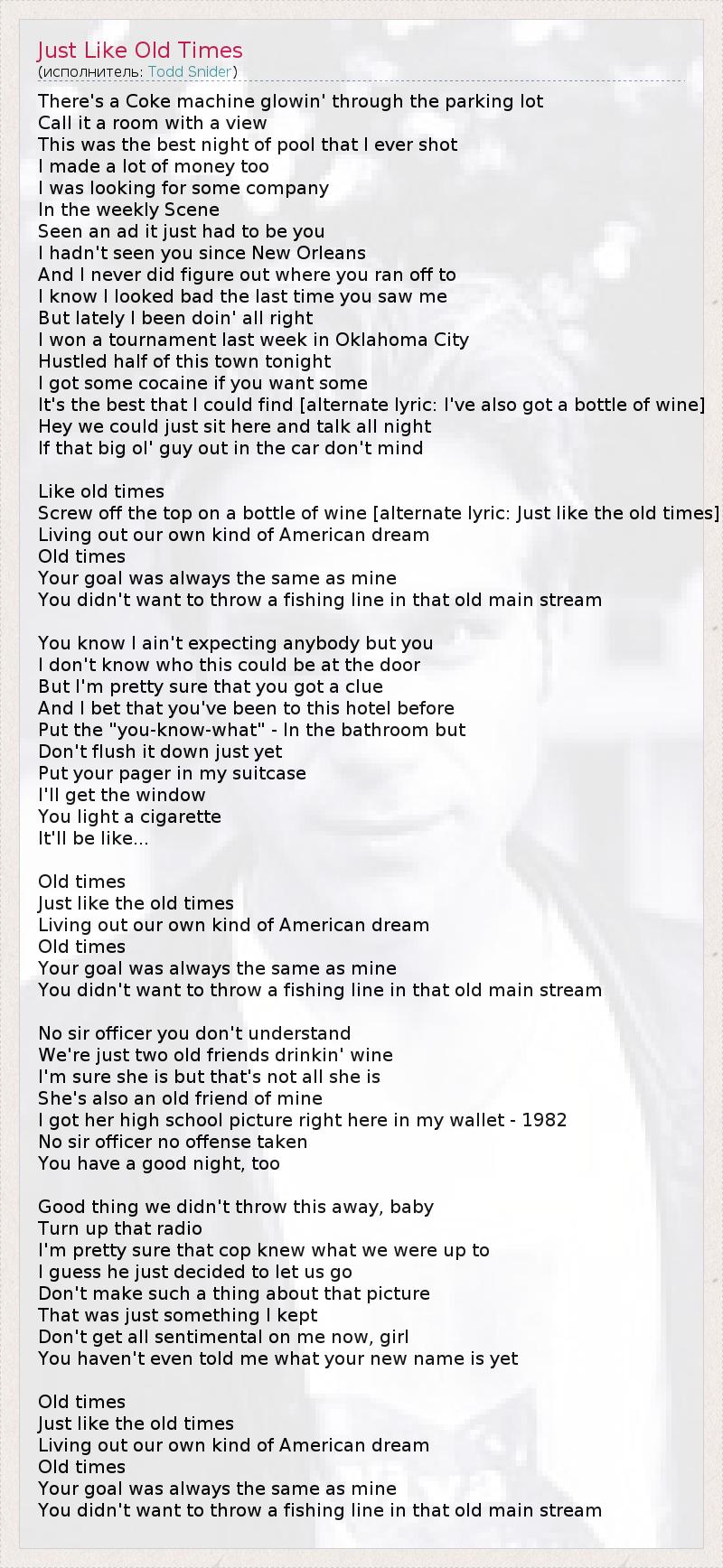 There's a Coke machine glowin' through the parking lot Call it a room with a view This was the best night of pool that I ever shot I made a lot of money too I was looking for some company In the weekly Scene Seen an ad it just had to be you I hadn't seen you since New Orleans And I never did figure out where you ran off to I know I looked bad the last time you saw me But lately I been doin' all right I won a tournament last week in Oklahoma City Hustled half of this town tonight I got some cocaine if you want some It's the best that I could find [alternate lyric: I've also got a bottle of wine] Hey we could just sit here and talk all night If that big ol' guy out in the car don't mind Like old times Screw off the top on a bottle of wine [alternate lyric: Just like the old times] Living out our own kind of American dream Old times Your goal was always the same as mine You didn't want to throw a fishing line in that old main stream You know I ain't expecting anybody but you I don't know who this could be at the door But I'm pretty sure that you got a clue And I bet that you've been to this hotel before Put the "you-know-what" - In the bathroom but Don't flush it down just yet Put your pager in my suitcase I'll get the window You light a cigarette It'll be like... Old times Just like the old times Living out our own kind of American dream Old times Your goal was always the same as mine You didn't want to throw a fishing line in that old main stream No sir officer you don't understand We're just two old friends drinkin' wine I'm sure she is but that's not all she is She's also an old friend of mine I got her high school picture right here in my wallet - 1982 No sir officer no offense taken You have a good night, too Good thing we didn't throw this away, baby Turn up that radio I'm pretty sure that cop knew what we were up to I guess he just decided to let us go Don't make such a thing about that picture That was just something I kept Don't get all sentimental on me now, girl You haven't even told me what your new name is yet Old times Just like the old times Living out our own kind of American dream Old times Your goal was always the same as mine You didn't want to throw a fishing line in that old main stream