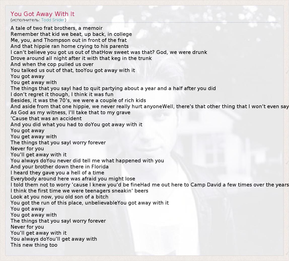 A tale of two frat brothers, a memoir Remember that kid we beat, up back, in college Me, you, and Thompson out in front of the frat And that hippie ran home crying to his parents I can't believe you got us out of thatHow sweet was that? God, we were drunk Drove around all night after it with that keg in the trunk And when the cop pulled us over You talked us out of that, tooYou got away with it You got away You get away with The things that you sayI had to quit partying about a year and a half after you did I don't regret it though, I think it was fun Besides, it was the 70's, we were a couple of rich kids And aside from that one hippie, we never really hurt anyoneWell, there's that other thing that I won't even say As God as my witness, I'll take that to my grave 'Cause that was an accident And you did what you had to doYou got away with it You got away You get away with The things that you sayI worry forever Never for you You'll get away with it You always doYou never did tell me what happened with you And your brother down there in Florida I heard they gave you a hell of a time Everybody around here was afraid you might lose I told them not to worry 'cause I knew you'd be fineHad me out here to Camp David a few times over the years I think the first time we were teenagers sneakin' beers Look at you now, you old son of a bitch You got the run of this place, unbelievableYou got away with it You got away You got away with The things that you sayI worry forever Never for you You'll get away with it You always doYou'll get away with This new thing too