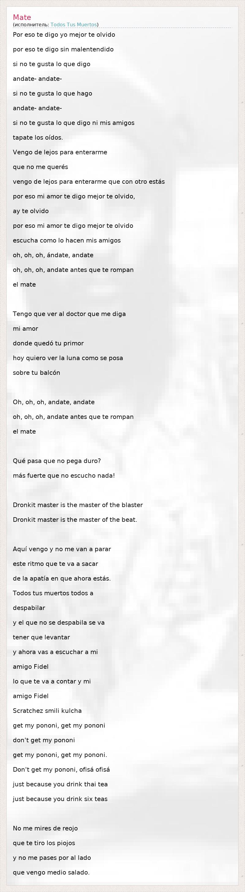Это интересно:Todos Tus Muertos — это регги-группа, созданная в Буэнос-Айреса, Аргентина. Группа образовалась в конце 80-х и выпустила в общей сложности 6 альбомов. В 2004 году три участника оригинального состава решили возродить группу, отправиться в турне и выпустить концертный альбом.Стилистика текстов носит остросоциальный характер. Также большое влияние на творчество музыкантов оказало движение растафарианства.Группа... продолжение