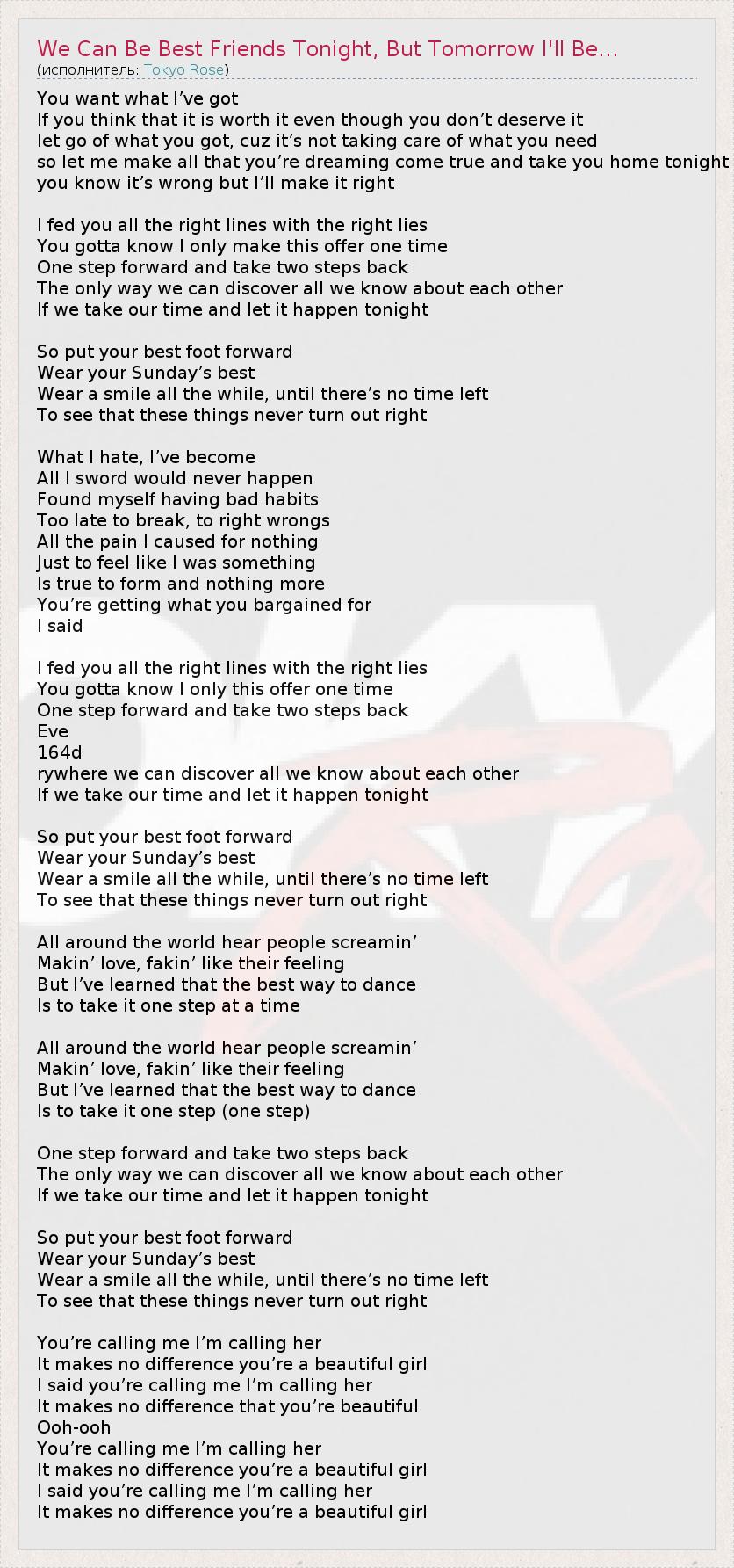 А как ты думаешь, о чем песня "We Can Be Best Friends Tonight, But Tomorrow I'll Be..." ?