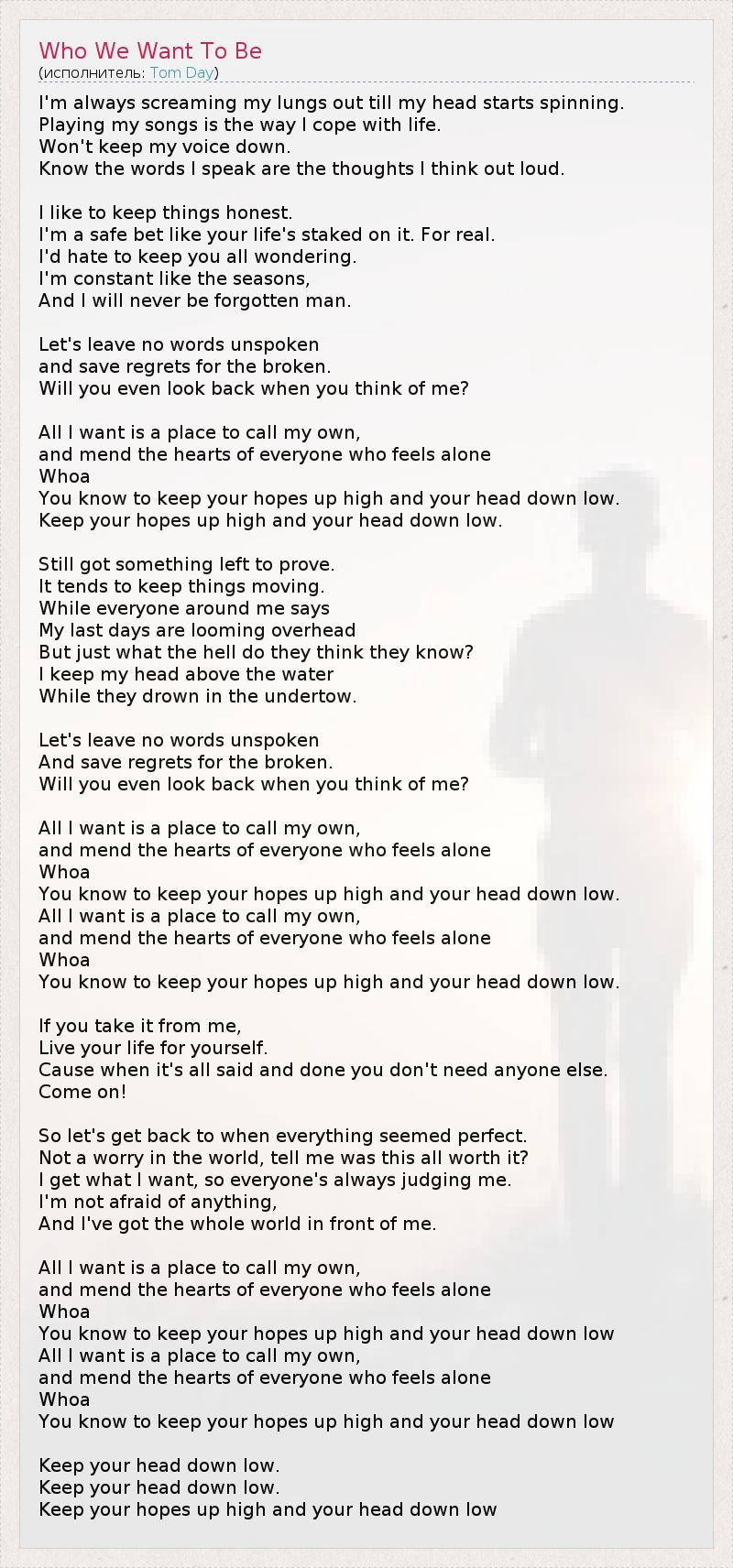 I'm always screaming my lungs out till my head starts spinning. Playing my songs is the way I cope with life. Won't keep my voice down. Know the words I speak are the thoughts I think out loud. I like to keep things honest. I'm a safe bet like your life's staked on it. For real. I'd hate to keep you all wondering. I'm constant like the seasons, And I will never be forgotten man. Let's leave no words unspoken and save regrets for the broken. Will you even look back when you think of me? All I want is a place to call my own, and mend the hearts of everyone who feels alone Whoa You know to keep your hopes up high and your head down low. Keep your hopes up high and your head down low. Still got something left to prove. It tends to keep things moving. While everyone around me says My last days are looming overhead But just what the hell do they think they know? I keep my head above the water While they drown in the undertow. Let's leave no words unspoken And save regrets for the broken. Will you even look back when you think of me? All I want is a place to call my own, and mend the hearts of everyone who feels alone Whoa You know to keep your hopes up high and your head down low. All I want is a place to call my own, and mend the hearts of everyone who feels alone Whoa You know to keep your hopes up high and your head down low. If you take it from me, Live your life for yourself. Cause when it's all said and done you don't need anyone else. Come on! So let's get back to when everything seemed perfect. Not a worry in the world, tell me was this all worth it? I get what I want, so everyone's always judging me. I'm not afraid of anything, And I've got the whole world in front of me. All I want is a place to call my own, and mend the hearts of everyone who feels alone Whoa You know to keep your hopes up high and your head down low All I want is a place to call my own, and mend the hearts of everyone who feels alone Whoa You know to keep your hopes up high and your head down low Keep your head down low. Keep your head down low. Keep your hopes up high and your head down low