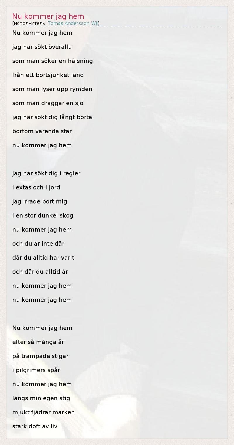 А как ты думаешь, о чем песня "Nu kommer jag hem" ?
