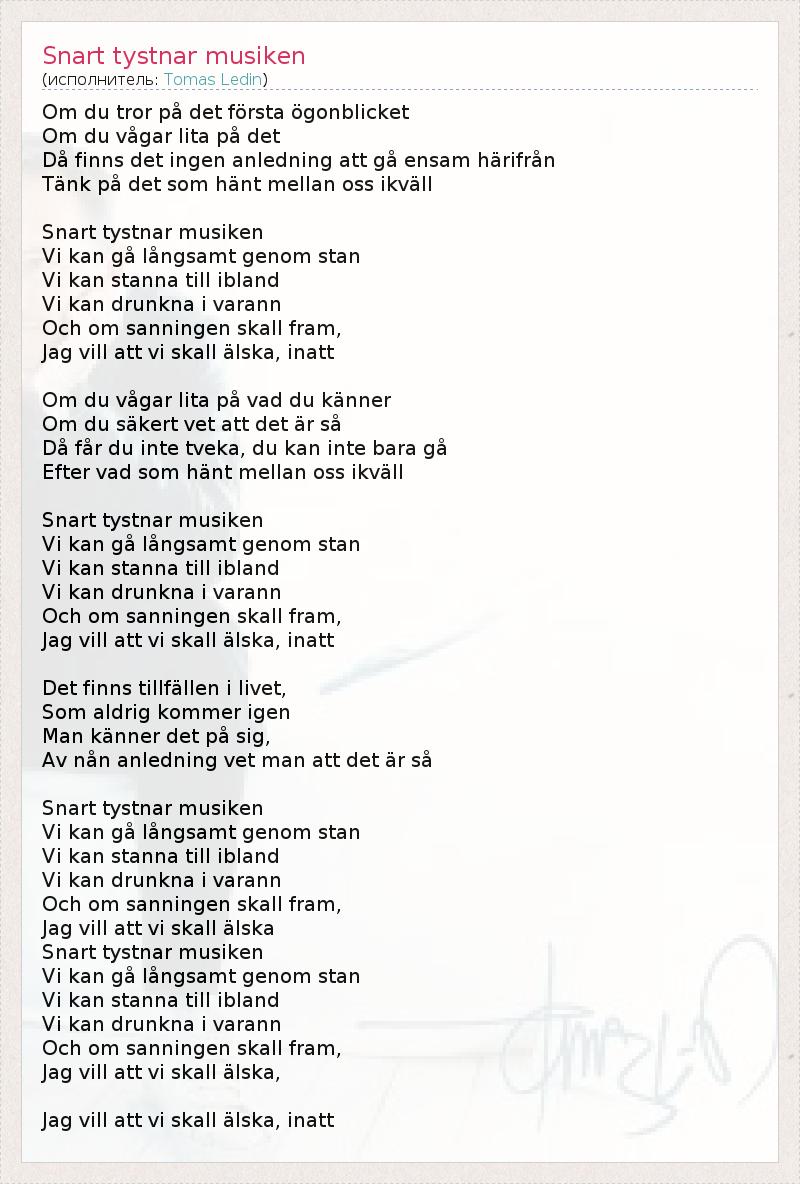 Om -дю- Tror взнос в Det Första ögonblicket Om -дю- Вагар Лита взнос в Det Да-да, финны Det Ingen anledning Att gå Ensam härifrån Танк взнос в Det Som Hant Меллан OSS ikväll Снарт tystnar musiken Vi кан gå långsamt геном стан Vi кан stanna до ibland Vi кан drunkna я varann Ох ом sanningen skall Фрам , Jag Vill Att VI skall älska , inatt Om -дю- Вагар Лита взнос в VAD -дю- Каннер Om Du säkert ветеринар Att Det är så Да-да, får дю инте tveka , дю Кан инте бара gå Efter VAD сом Hant Меллан OSS ikväll Снарт tystnar musiken Vi кан gå långsamt геном стан Vi кан stanna до ibland Vi кан drunkna я varann Ох ом sanningen skall Фрам , Jag Vill Att VI skall älska , inatt Det финны tillfällen я livet , Сом Aldrig Kommer IGEN Человек Каннер Det взнос в сиг, Av Нан anledning ветеринар человек Att Det är så Снарт tystnar musiken Vi кан gå långsamt геном стан Vi кан stanna до ibland Vi кан drunkna я varann Ох ом sanningen skall Фрам , Jag Vill Att VI skall älska Снарт tystnar musiken Vi кан gå långsamt геном стан Vi кан stanna до ibland Vi кан drunkna я varann Ох ом sanningen skall Фрам , Jag Vill Att VI skall älska , Jag Vill Att VI skall älska , inatt