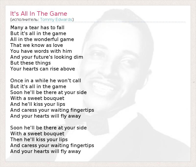 Many a tear has to fall But it's all in the game All in the wonderful game That we know as love You have words with him And your future's looking dim But these things Your hearts can rise above Once in a while he won't call But it's all in the game Soon he'll be there at your side With a sweet bouquet And he'll kiss your lips And caress your waiting fingertips And your hearts will fly away Soon he'll be there at your side With a sweet bouquet Then he'll kiss your lips And caress your waiting fingertips And your hearts will fly away