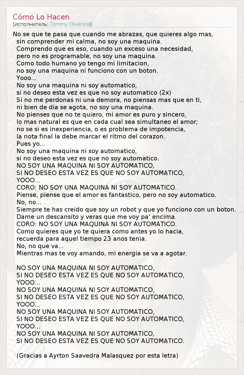 No se que te pasa que cuando me abrazas, que quieres algo mas, sin comprender mi calma, no soy una maquina. Comprendo que es eso, cuando un exceso una necesidad, pero no es programable, no soy una maquina. Como todo humano yo tengo mi limitacion, no soy una maquina ni funciono con un boton. Yooo... No soy una maquina ni soy automatico, si no deseo esta vez es que no soy automatico (2x) Si no me perdonas ni una demora, no piensas mas que en ti, ni bien de dia se agota, no soy una maquina. No pienses que no te quiero, mi amor es puro y sincero, lo mas natural es que en cada cual sea simultaneo el amor; no se si es inexperiencia, o es problema de impotencia, la nota final la debe marcar el ritmo del corazon. Pues yo... No soy una maquina ni soy automatico, si no deseo esta vez es que no soy automatico. NO SOY UNA MAQUINA NI SOY AUTOMATICO, SI NO DESEO ESTA VEZ ES QUE NO SOY AUTOMATICO, YOOO... CORO: NO SOY UNA MAQUINA NI SOY AUTOMATICO. Piense, piense que el amor es fantastico, pero no soy automatico. No, no... Siempre te has creido que soy un robot y que yo funciono con un boton. Dame un descansito y veras que me voy pa' encima. CORO: NO SOY UNA MAQUINA NI SOY AUTOMATICO. Como quieres que yo te quiera como antes yo lo hacia, recuerda para aquel tiempo 23 anos tenia. No, no que va... Mientras mas te voy amando, mi energia se va a agotar. NO SOY UNA MAQUINA NI SOY AUTOMATICO, SI NO DESEO ESTA VEZ ES QUE NO SOY AUTOMATICO, YOOO... NO SOY UNA MAQUINA NI SOY AUTOMATICO, SI NO DESEO ESTA VEZ ES QUE NO SOY AUTOMATICO, YOOO... NO SOY UNA MAQUINA NI SOY AUTOMATICO, SI NO DESEO ESTA VEZ ES QUE NO SOY AUTOMATICO, YOOO... NO SOY UNA MAQUINA NI SOY AUTOMATICO, SI NO DESEO ESTA VEZ ES QUE NO SOY AUTOMATICO. (Gracias a Ayrton Saavedra Malasquez por esta letra)