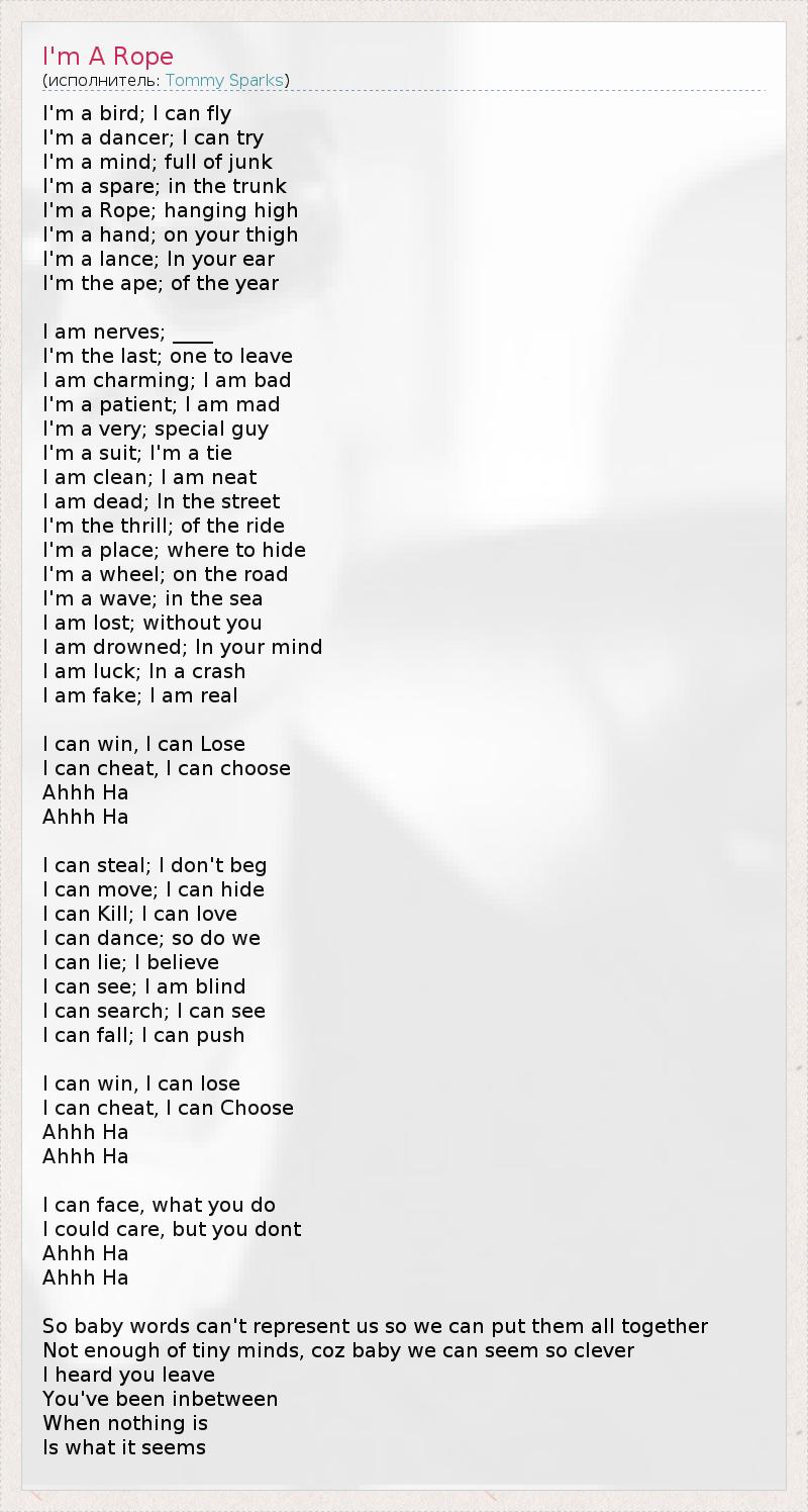 I'm a bird; I can fly I'm a dancer; I can try I'm a mind; full of junk I'm a spare; in the trunk I'm a Rope; hanging high I'm a hand; on your thigh I'm a lance; In your ear I'm the ape; of the year I am nerves; ____ I'm the last; one to leave I am charming; I am bad I'm a patient; I am mad I'm a very; special guy I'm a suit; I'm a tie I am clean; I am neat I am dead; In the street I'm the thrill; of the ride I'm a place; where to hide I'm a wheel; on the road I'm a wave; in the sea I am lost; without you I am drowned; In your mind I am luck; In a crash I am fake; I am real I can win, I can Lose I can cheat, I can choose Ahhh Ha Ahhh Ha I can steal; I don't beg I can move; I can hide I can Kill; I can love I can dance; so do we I can lie; I believe I can see; I am blind I can search; I can see I can fall; I can push I can win, I can lose I can cheat, I can Choose Ahhh Ha Ahhh Ha I can face, what you do I could care, but you dont Ahhh Ha Ahhh Ha So baby words can't represent us so we can put them all together Not enough of tiny minds, coz baby we can seem so clever I heard you leave You've been inbetween When nothing is Is what it seems