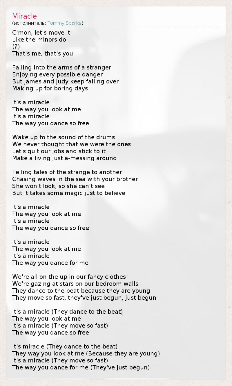 C'mon, let's move it Like the minors do (?) That's me, that's you Falling into the arms of a stranger Enjoying every possible danger But James and Judy keep falling over Making up for boring days It's a miracle The way you look at me It's a miracle The way you dance so free Wake up to the sound of the drums We never thought that we were the ones Let's quit our jobs and stick to it Make a living just a-messing around Telling tales of the strange to another Chasing waves in the sea with your brother She won't look, so she can't see But it takes some magic just to believe It's a miracle The way you look at me It's a miracle The way you dance so free It's a miracle The way you look at me It's a miracle The way you dance for me We're all on the up in our fancy clothes We're gazing at stars on our bedroom walls They dance to the beat because they are young They move so fast, they've just begun, just begun It's a miracle (They dance to the beat) The way you look at me It's a miracle (They move so fast) The way you dance so free It's miracle (They dance to the beat) They way you look at me (Because they are young) It's a miracle (They move so fast) The way you dance for me (They've just begun)