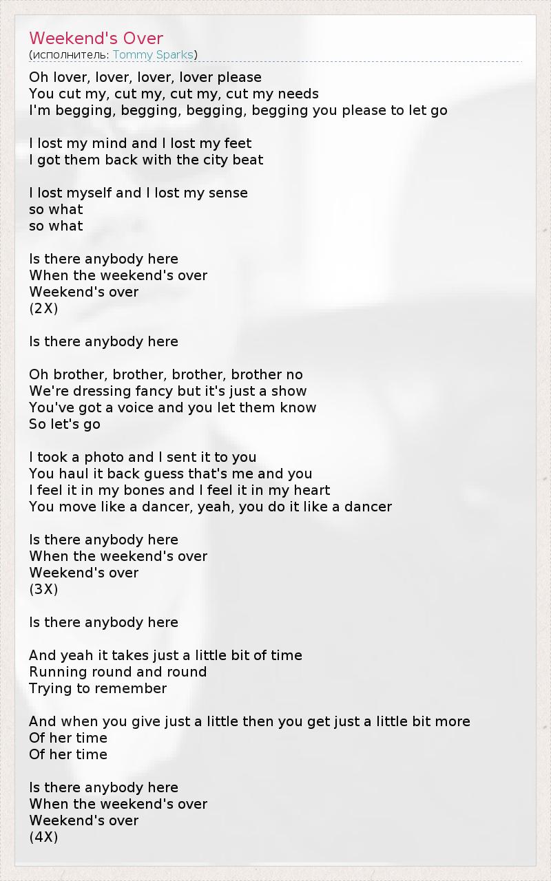 Oh lover, lover, lover, lover please You cut my, cut my, cut my, cut my needs I'm begging, begging, begging, begging you please to let go I lost my mind and I lost my feet I got them back with the city beat I lost myself and I lost my sense so what so what Is there anybody here When the weekend's over Weekend's over (2X) Is there anybody here Oh brother, brother, brother, brother no We're dressing fancy but it's just a show You've got a voice and you let them know So let's go I took a photo and I sent it to you You haul it back guess that's me and you I feel it in my bones and I feel it in my heart You move like a dancer, yeah, you do it like a dancer Is there anybody here When the weekend's over Weekend's over (3X) Is there anybody here And yeah it takes just a little bit of time Running round and round Trying to remember And when you give just a little then you get just a little bit more Of her time Of her time Is there anybody here When the weekend's over Weekend's over (4X)