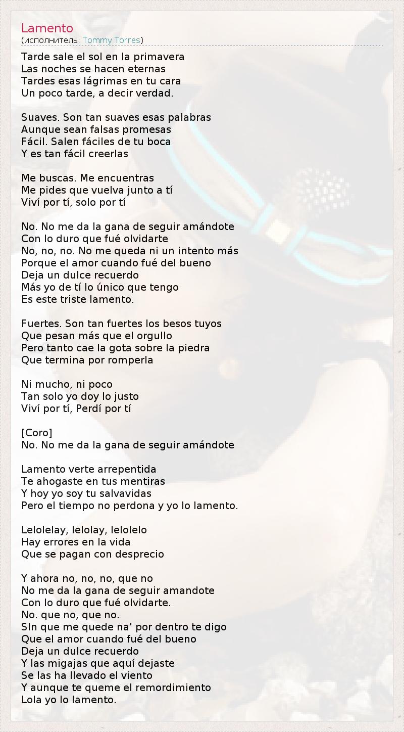 Тард Sale El Sol En La Primavera Лас- Noches себе Хасен eternas Тард ЭСУ Lágrimas ан Ту Cara Un Poco Тард ,decir Verdad . Suaves . Сын загар suaves ЭСУ Palabras Aunque Шон falsas Promesas Fácil . Сален fáciles де та нов Бока Y -эс- коричневые FACIL creerlas Я buscas . Я encuentras Я pides Que Vuelva Juntotí Виви POR TI, соло POR tí Нет, нет мне да ла гана -де- seguir Amandote Con вот Дуро Que ФРУ Olvidarte Нет, нет, нет. Нет мне Каида Ni ООН intento más Porque El Amor Cuando ФРУ -дель- Буэно Deja ООН Дульсе Recuerdo MAS йо -де- tí ло Único Que Tengo Es -Эсте расстроенный Lamento . Fuertes . Сын загар Fuertes Лос- BESOS tuyos Que pesan más Que эль Orgullo Перо танто CAE -ла- Гота Sobre ла -Пьедра Que Терминалы POR romperla Ni Mucho , Ni росо Тан соло лет дой вот Хусто Виви POR TI, Perdí POR tí [ Коро ] Нет, нет мне да ла гана -де- seguir Amandote Lamento Verte arrepentida Те ahogaste EN Тус Mentiras Y Хой Yo Soy Tu salvavidas Перо -эль- не Tiempo Нет perdona Y йо ло Lamento . Lelolelay , lelolay , lelolelo Hay errores En La Vida Que себе языческое против desprecio Y Ahora нет, нет , нет, Que нет Нет мне да ла гана -де- seguir Amandote Con вот Дуро Que ФРУ Olvidarte . Количество Que нет, Que нет. SIn Que мне quede на " POR Dentro те DIGO Que El Amor Cuando ФРУ -дель- Буэно Deja ООН Дульсе Recuerdo Y -лас- migajas Que aquí dejaste Se -лас- ха Llevado -эль- Viento Y aunque те queme эль remordimiento Лола лет вот Lamento .