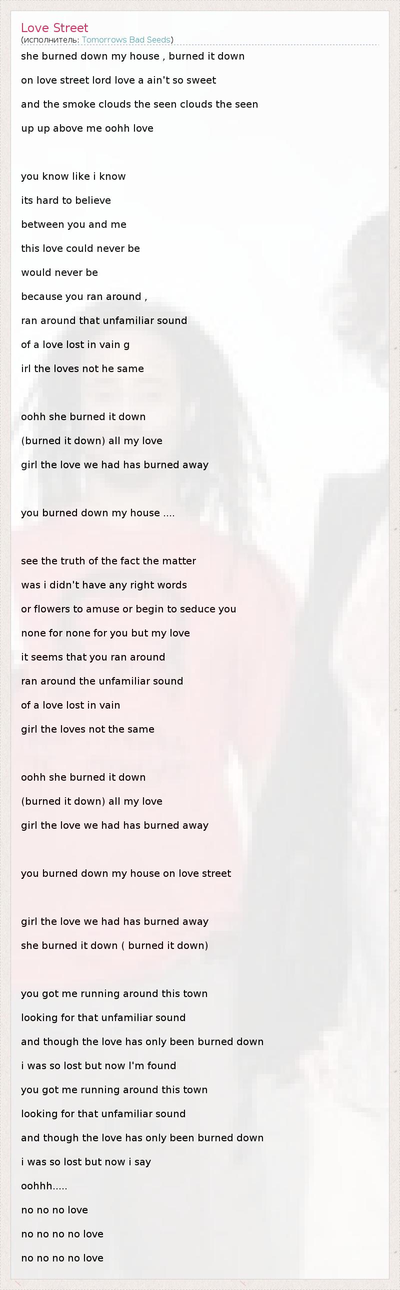 she burned down my house , burned it down on love street lord love a ain't so sweet and the smoke clouds the seen clouds the seen up up above me oohh love you know like i know its hard to believe between you and me this love could never be would never be because you ran around , ran around that unfamiliar sound of a love lost in vain g irl the loves not he same oohh she burned it down (burned it down) all my love girl the love we had has burned away you burned down my house .... see the truth of the fact the matter was i didn't have any right words or flowers to amuse or begin to seduce you none for none for you but my love it seems that you ran around ran around the unfamiliar sound of a love lost in vain girl the loves not the same oohh she burned it down (burned it down) all my love girl the love we had has burned away you burned down my house on love street girl the love we had has burned away she burned it down ( burned it down) you got me running around this town looking for that unfamiliar sound and though the love has only been burned down i was so lost but now I'm found you got me running around this town looking for that unfamiliar sound and though the love has only been burned down i was so lost but now i say oohhh..... no no no love no no no no love no no no no love