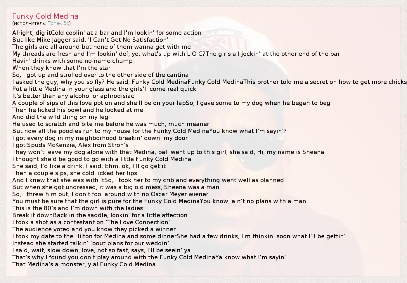 А как ты думаешь, о чем песня "Funky Cold Medina" ?
