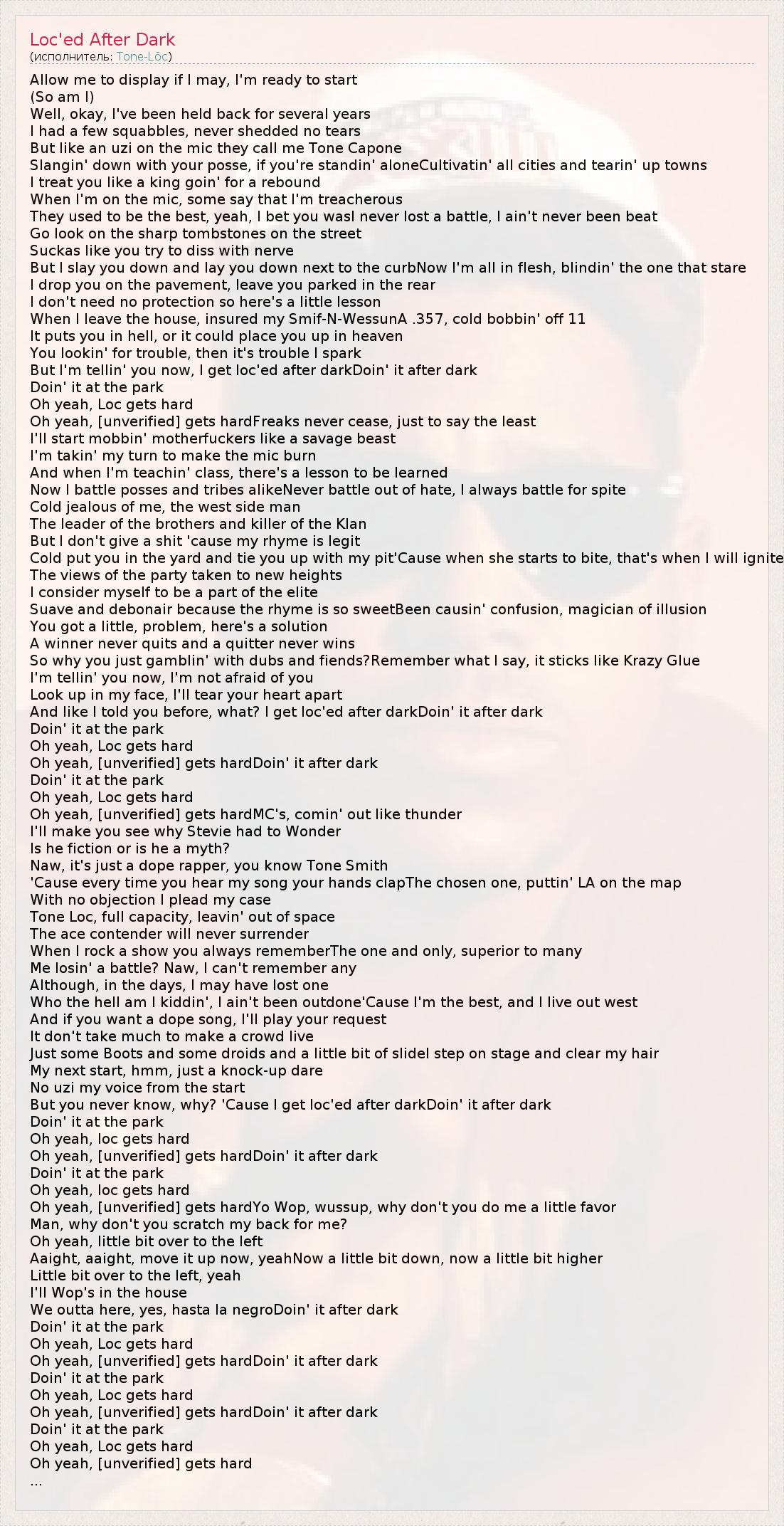 Это интересно:Рэппер и киноактер Tone Loc (настоящее имя Anthony Terrell Smith) - родился 3 марта 1966 года в Комптоне, Лос Анжелес, штат Калифорния.Как и множеству чернокожих подростков из бедных кварталов Лос Анжелеса, Энтони Смиту, приходилось выживать в борьбе за существование на улицах своего района, не надеясь на заоблачные перспективы в будущем.Получив от друзей прозвище "Antonio Loco", он провел свою... продолжение