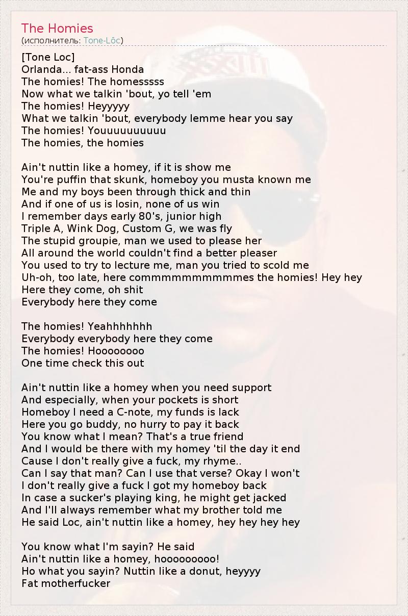[Tone Loc] Orlanda... fat-ass Honda The homies! The homesssss Now what we talkin 'bout, yo tell 'em The homies! Heyyyyy What we talkin 'bout, everybody lemme hear you say The homies! Youuuuuuuuuu The homies, the homies Ain't nuttin like a homey, if it is show me You're puffin that skunk, homeboy you musta known me Me and my boys been through thick and thin And if one of us is losin, none of us win I remember days early 80's, junior high Triple A, Wink Dog, Custom G, we was fly The stupid groupie, man we used to please her All around the world couldn't find a better pleaser You used to try to lecture me, man you tried to scold me Uh-oh, too late, here commmmmmmmmmes the homies! Hey hey Here they come, oh shit Everybody here they come The homies! Yeahhhhhhh Everybody everybody here they come The homies! Hoooooooo One time check this out Ain't nuttin like a homey when you need support And especially, when your pockets is short Homeboy I need a C-note, my funds is lack Here you go buddy, no hurry to pay it back You know what I mean? That's a true friend And I would be there with my homey 'til the day it end Cause I don't really give a fuck, my rhyme.. Can I say that man? Can I use that verse? Okay I won't I don't really give a fuck I got my homeboy back In case a sucker's playing king, he might get jacked And I'll always remember what my brother told me He said Loc, ain't nuttin like a homey, hey hey hey hey You know what I'm sayin? He said Ain't nuttin like a homey, hooooooooo! Ho what you sayin? Nuttin like a donut, heyyyy Fat motherfucker