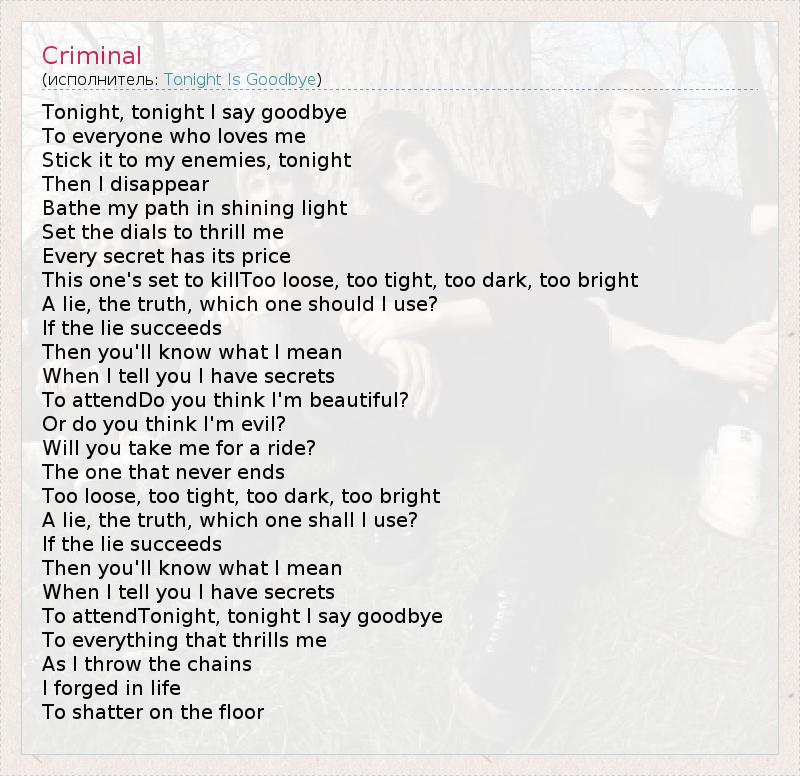 Tonight, tonight I say goodbye To everyone who loves me Stick it to my enemies, tonight Then I disappear Bathe my path in shining light Set the dials to thrill me Every secret has its price This one's set to killToo loose, too tight, too dark, too bright A lie, the truth, which one should I use? If the lie succeeds Then you'll know what I mean When I tell you I have secrets To attendDo you think I'm beautiful? Or do you think I'm evil? Will you take me for a ride? The one that never ends Too loose, too tight, too dark, too bright A lie, the truth, which one shall I use? If the lie succeeds Then you'll know what I mean When I tell you I have secrets To attendTonight, tonight I say goodbye To everything that thrills me As I throw the chains I forged in life To shatter on the floor