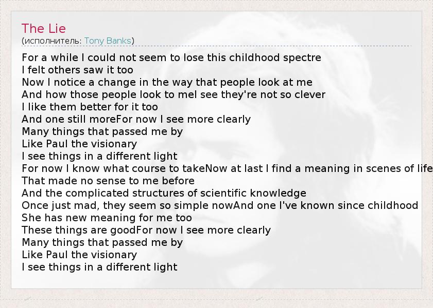 For a while I could not seem to lose this childhood spectre I felt others saw it too Now I notice a change in the way that people look at me And how those people look to meI see they're not so clever I like them better for it too And one still moreFor now I see more clearly Many things that passed me by Like Paul the visionary I see things in a different light For now I know what course to takeNow at last I find a meaning in scenes of life That made no sense to me before And the complicated structures of scientific knowledge Once just mad, they seem so simple nowAnd one I've known since childhood She has new meaning for me too These things are goodFor now I see more clearly Many things that passed me by Like Paul the visionary I see things in a different light