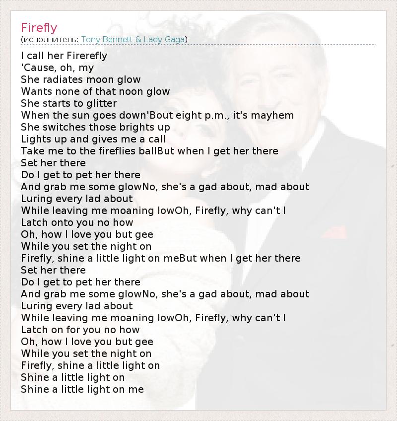 I call her Firerefly 'Cause, oh, my She radiates moon glow Wants none of that noon glow She starts to glitter When the sun goes down'Bout eight p.m., it's mayhem She switches those brights up Lights up and gives me a call Take me to the fireflies ballBut when I get her there Set her there Do I get to pet her there And grab me some glowNo, she's a gad about, mad about Luring every lad about While leaving me moaning lowOh, Firefly, why can't I Latch onto you no how Oh, how I love you but gee While you set the night on Firefly, shine a little light on meBut when I get her there Set her there Do I get to pet her there And grab me some glowNo, she's a gad about, mad about Luring every lad about While leaving me moaning lowOh, Firefly, why can't I Latch on for you no how Oh, how I love you but gee While you set the night on Firefly, shine a little light on Shine a little light on Shine a little light on me