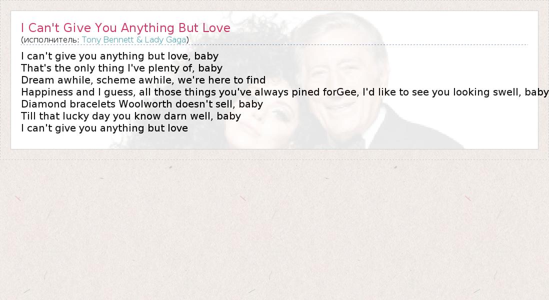 ГлавнаяИсполнителиTony Bennett & Lady GagaI Can't Give You Anything But Love