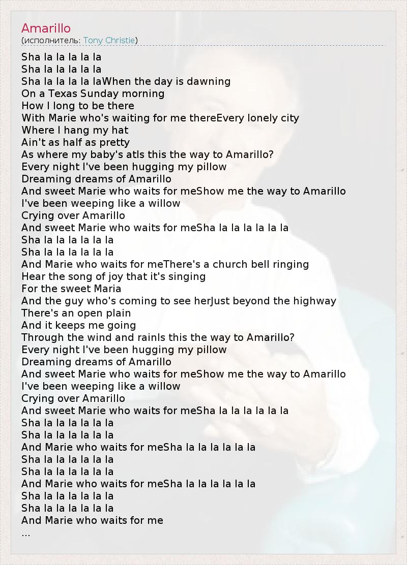 Sha la la la la la Sha la la la la la Sha la la la la laWhen the day is dawning On a Texas Sunday morning How I long to be there With Marie who's waiting for me thereEvery lonely city Where I hang my hat Ain't as half as pretty As where my baby's atIs this the way to Amarillo? Every night I've been hugging my pillow Dreaming dreams of Amarillo And sweet Marie who waits for meShow me the way to Amarillo I've been weeping like a willow Crying over Amarillo And sweet Marie who waits for meSha la la la la la la Sha la la la la la la Sha la la la la la la And Marie who waits for meThere's a church bell ringing Hear the song of joy that it's singing For the sweet Maria And the guy who's coming to see herJust beyond the highway There's an open plain And it keeps me going Through the wind and rainIs this the way to Amarillo? Every night I've been hugging my pillow Dreaming dreams of Amarillo And sweet Marie who waits for meShow me the way to Amarillo I've been weeping like a willow Crying over Amarillo And sweet Marie who waits for meSha la la la la la la Sha la la la la la la Sha la la la la la la And Marie who waits for meSha la la la la la la Sha la la la la la la Sha la la la la la la And Marie who waits for meSha la la la la la la Sha la la la la la la Sha la la la la la la And Marie who waits for me ...