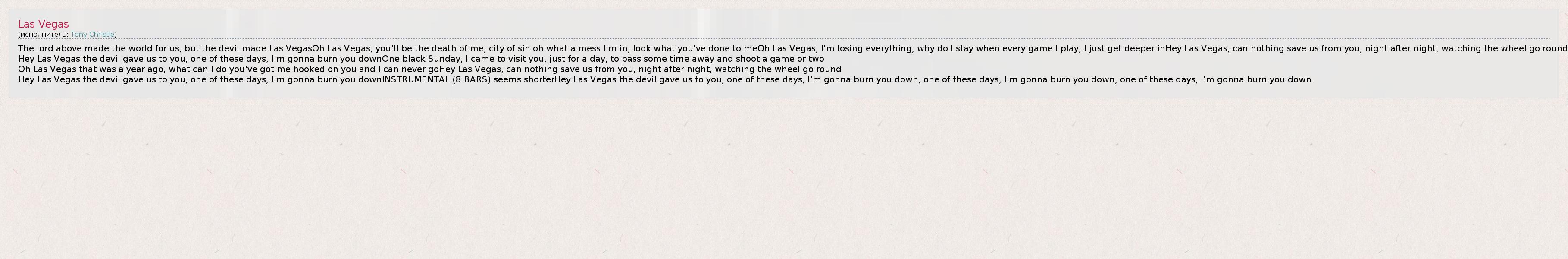 The lord above made the world for us, but the devil made Las VegasOh Las Vegas, you'll be the death of me, city of sin oh what a mess I'm in, look what you've done to meOh Las Vegas, I'm losing everything, why do I stay when every game I play, I just get deeper inHey Las Vegas, can nothing save us from you, night after night, watching the wheel go round Hey Las Vegas the devil gave us to you, one of these days, I'm gonna burn you downOne black Sunday, I came to visit you, just for a day, to pass some time away and shoot a game or two Oh Las Vegas that was a year ago, what can I do you've got me hooked on you and I can never goHey Las Vegas, can nothing save us from you, night after night, watching the wheel go round Hey Las Vegas the devil gave us to you, one of these days, I'm gonna burn you downINSTRUMENTAL (8 BARS) seems shorterHey Las Vegas the devil gave us to you, one of these days, I'm gonna burn you down, one of these days, I'm gonna burn you down, one of these days, I'm gonna burn you down.
