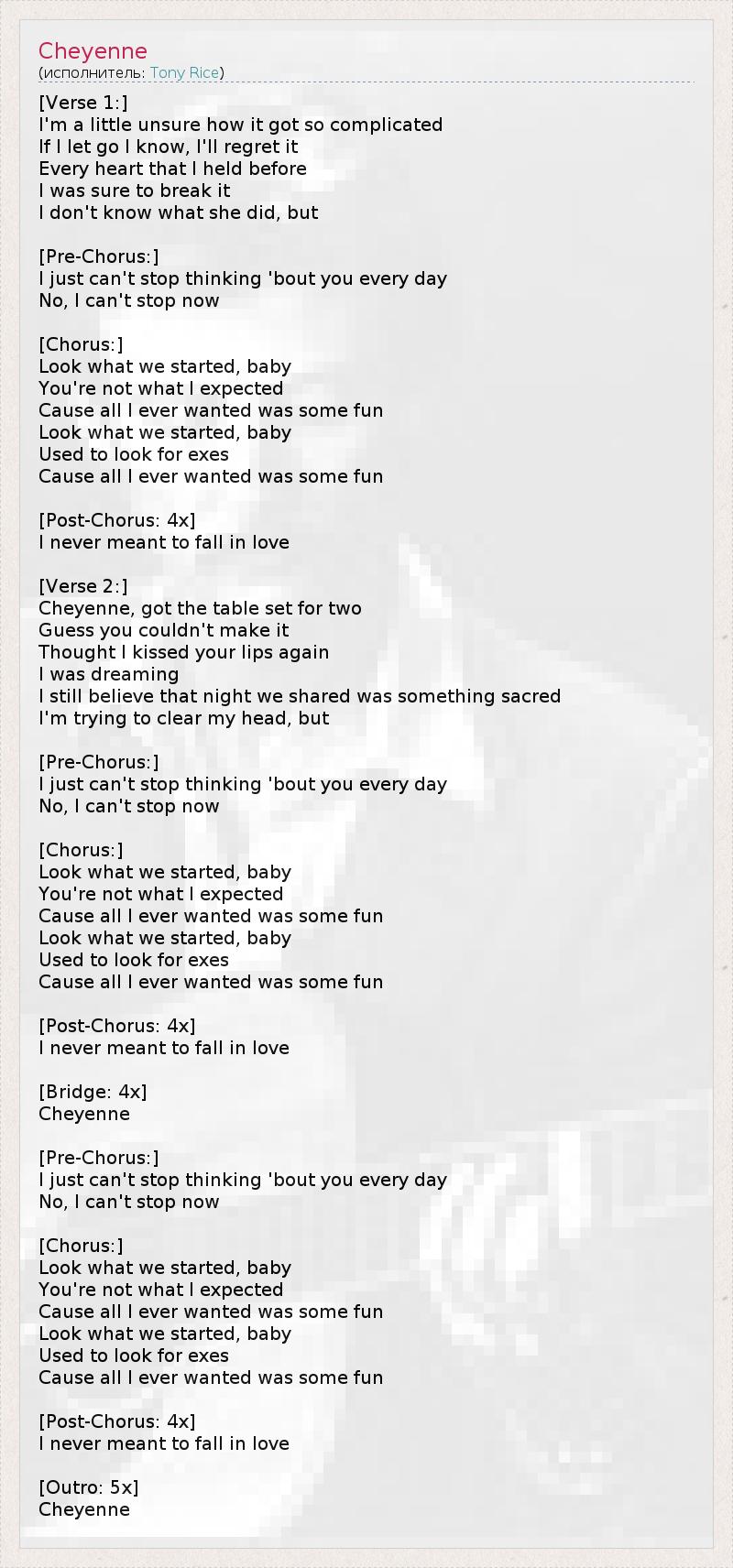 [Verse 1:] I'm a little unsure how it got so complicated If I let go I know, I'll regret it Every heart that I held before I was sure to break it I don't know what she did, but [Pre-Chorus:] I just can't stop thinking 'bout you every day No, I can't stop now [Chorus:] Look what we started, baby You're not what I expected Cause all I ever wanted was some fun Look what we started, baby Used to look for exes Cause all I ever wanted was some fun [Post-Chorus: 4x] I never meant to fall in love [Verse 2:] Cheyenne, got the table set for two Guess you couldn't make it Thought I kissed your lips again I was dreaming I still believe that night we shared was something sacred I'm trying to clear my head, but [Pre-Chorus:] I just can't stop thinking 'bout you every day No, I can't stop now [Chorus:] Look what we started, baby You're not what I expected Cause all I ever wanted was some fun Look what we started, baby Used to look for exes Cause all I ever wanted was some fun [Post-Chorus: 4x] I never meant to fall in love [Bridge: 4x] Cheyenne [Pre-Chorus:] I just can't stop thinking 'bout you every day No, I can't stop now [Chorus:] Look what we started, baby You're not what I expected Cause all I ever wanted was some fun Look what we started, baby Used to look for exes Cause all I ever wanted was some fun [Post-Chorus: 4x] I never meant to fall in love [Outro: 5x] Cheyenne